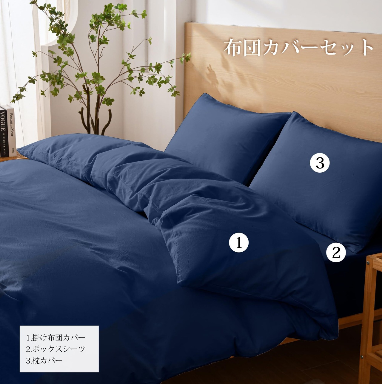 AYO 寝具カバーセット 布団カバーセット 洗いざらし シワ加工 水洗い やわらか (掛け布団カバー ボックスシーツ 枕カバー)吸水速乾 丸洗いOK 肌に優しい 無地 シンプル オールシーズン(シングル・3点セット ネイビー)