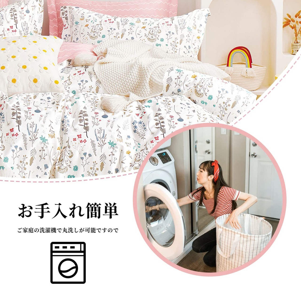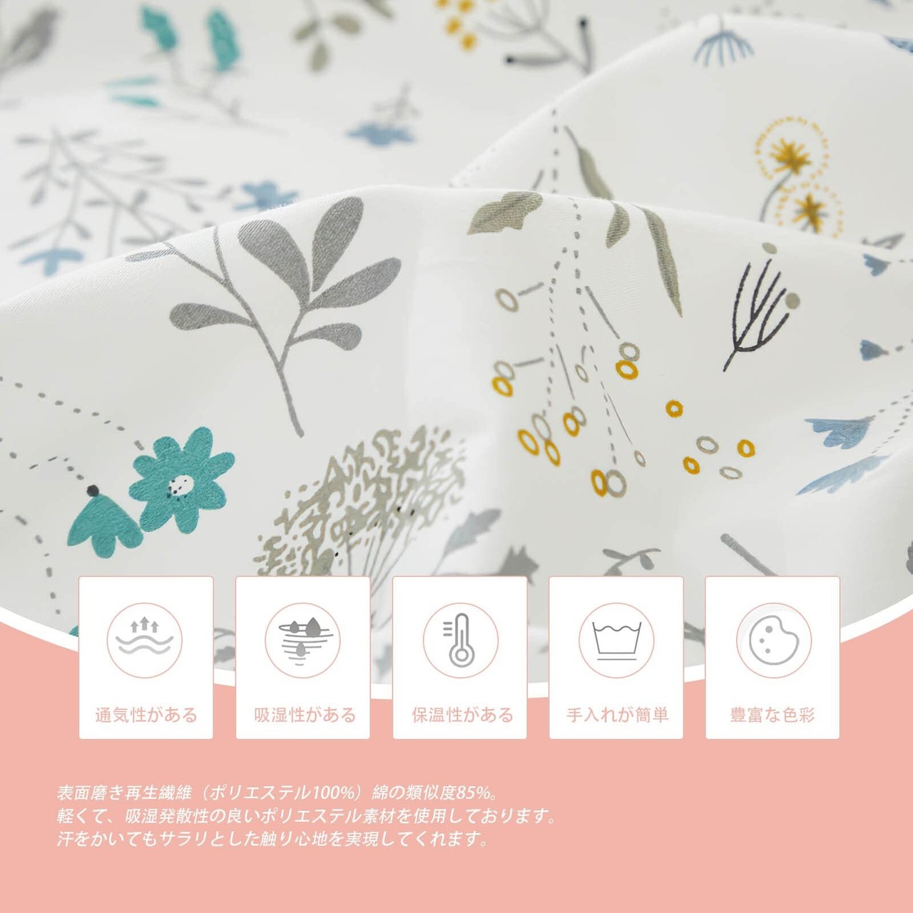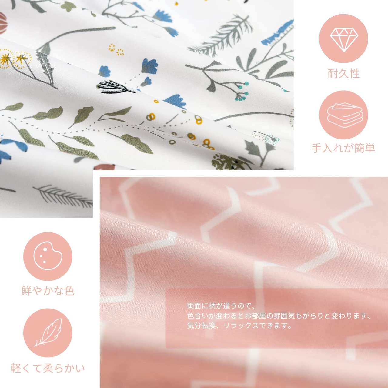 【仕様】掛けふとんカバー:片側194cmファスナー付き、8ヶ所ヒモ付き ボックスシーツ:全周ゴム仕様 ピロケース:封筒式