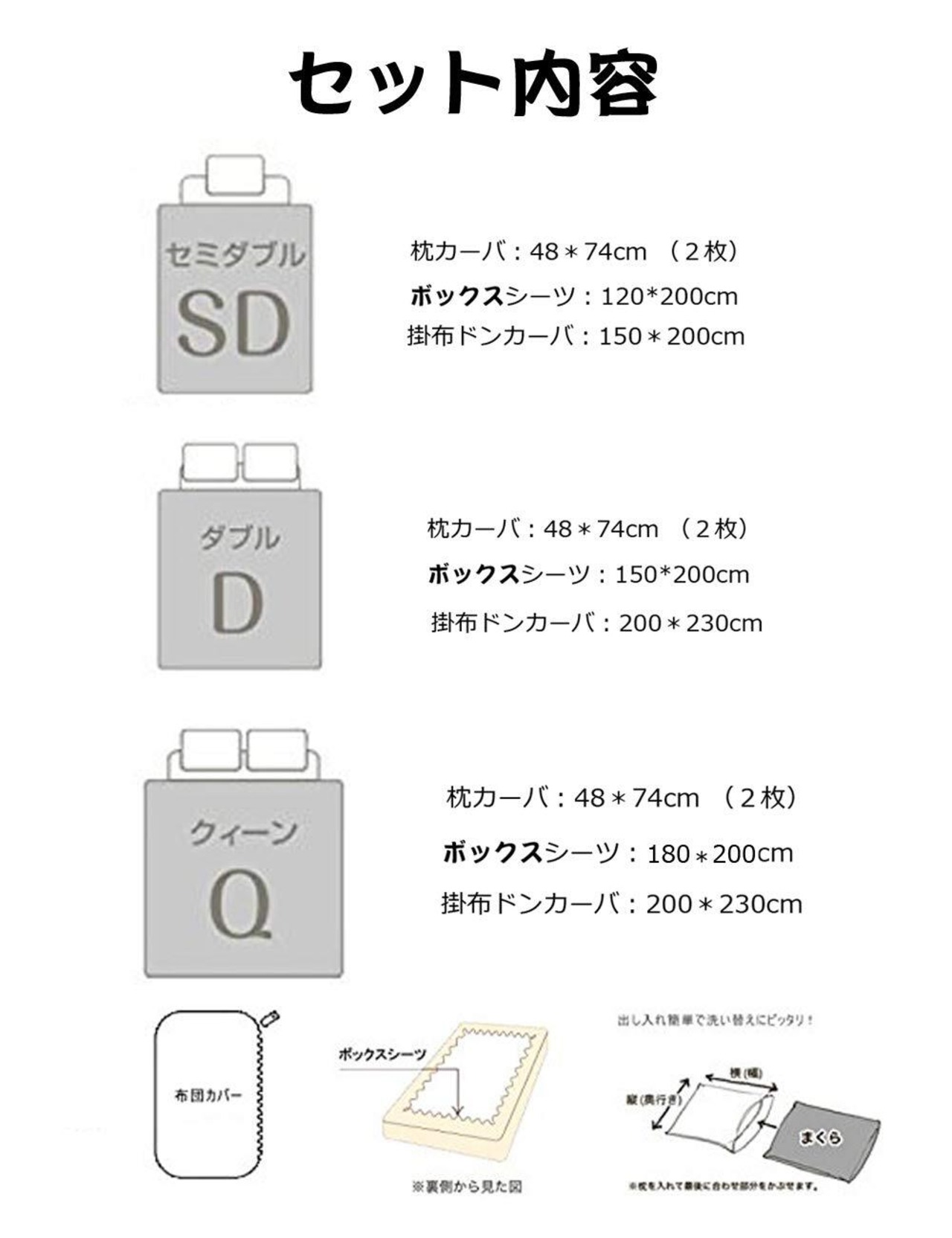 ボックスシーツ仕様:伸縮性が良いゴムが入るために、ズレにくい。布団カバーはファスナー使用,布団本体との固定にヒモがついています。