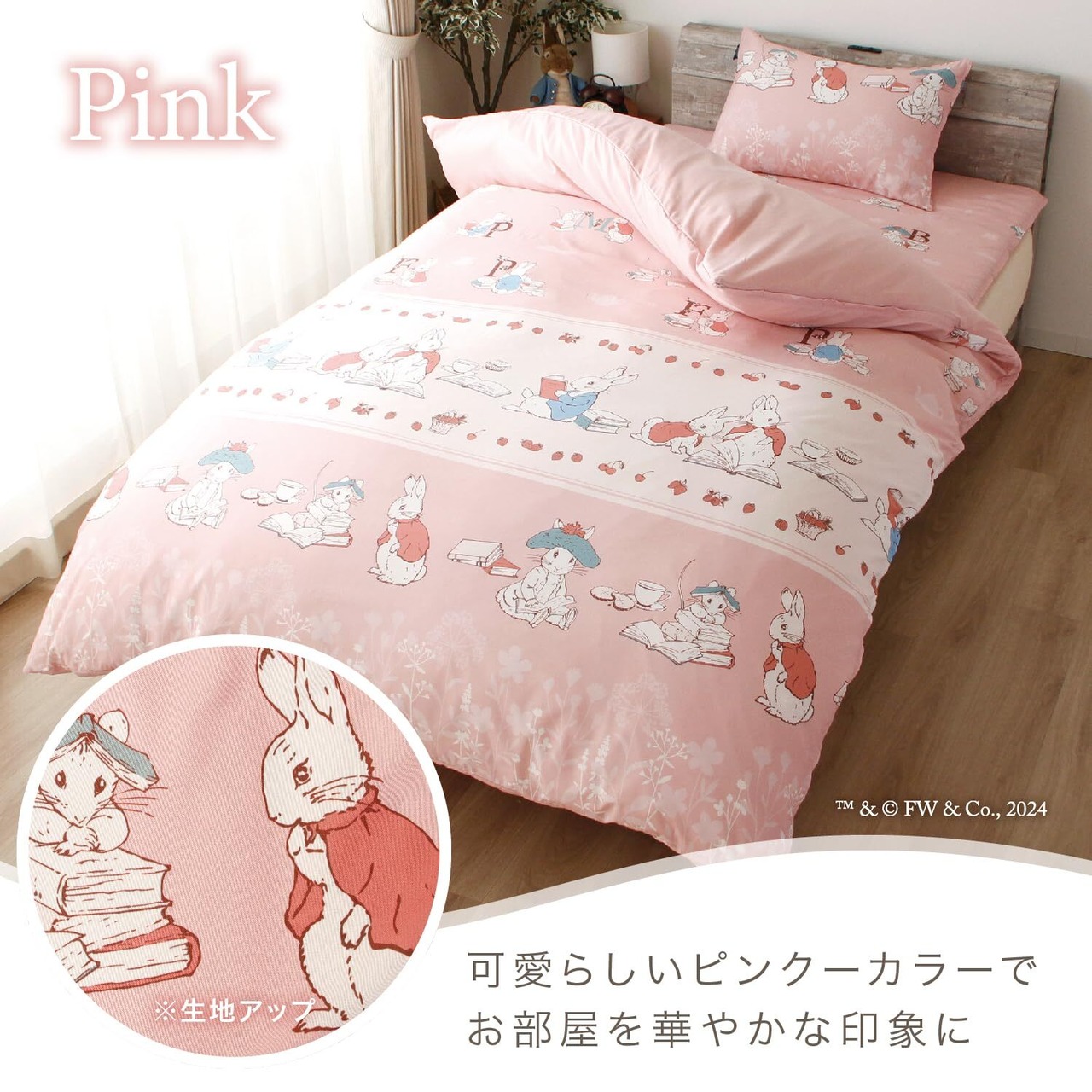 メリーナイト ピーターラビット(TM) 掛布団カバー 「リトルブック」 コーラルピンク 約150×210cm シングルロング 出し入れ簡単 片側210cmファスナー 8か所ヒモ付き 就寝中の布団のズレを防止 ポリエステル ピーチスキン加工 滑らかな肌触り速乾 シワになりにくい お手入れ簡単 カジュアル 大人可愛い プリント柄 アプリイ・ダプリイ™ 赤りすナトキン™ 洗える PR122009-16