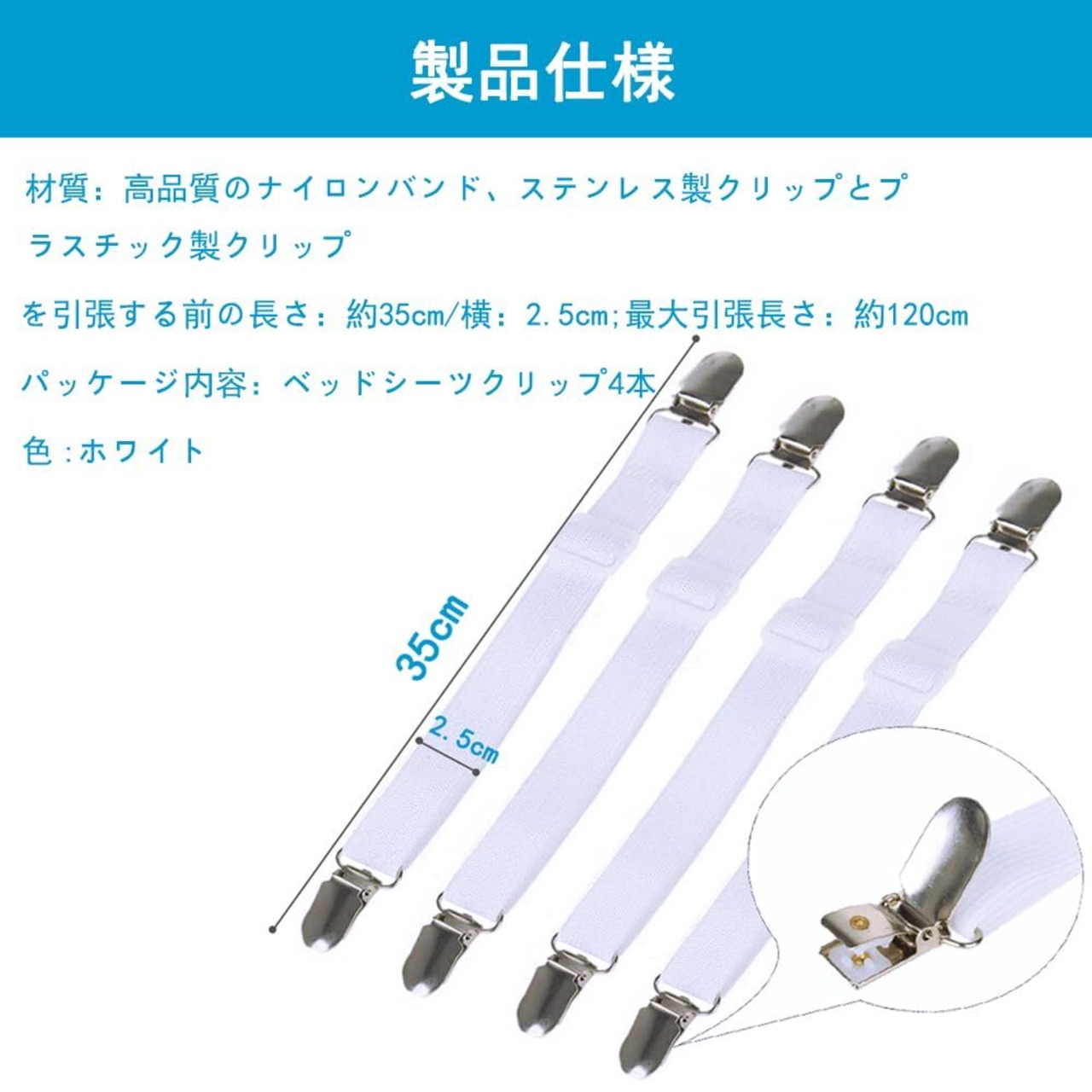 KIMLONTON ベッドシーツクリップ 敷きパッド・ ベッド固定ズレ防止クリップ 布団シーツ用滑り止めゴムバンド 4本セット 調整でき約120cm 白