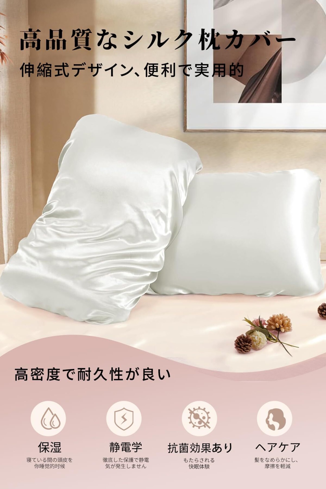 【ユニークな伸縮ストラップデザイン】 このシルク 枕カバーは独自の伸縮性ストラップデザインにより、枕にしっかり固定され、寝返りを打ってもズレにくく、非常に実用的です。どんな形や素材の枕にも数秒でフィットし、金属製のファスナーがないため快適で安定した使い心地を提供します。シルク 枕カバーは手のひらサイズに折りたため、出張や旅行時の携帯にも便利です。