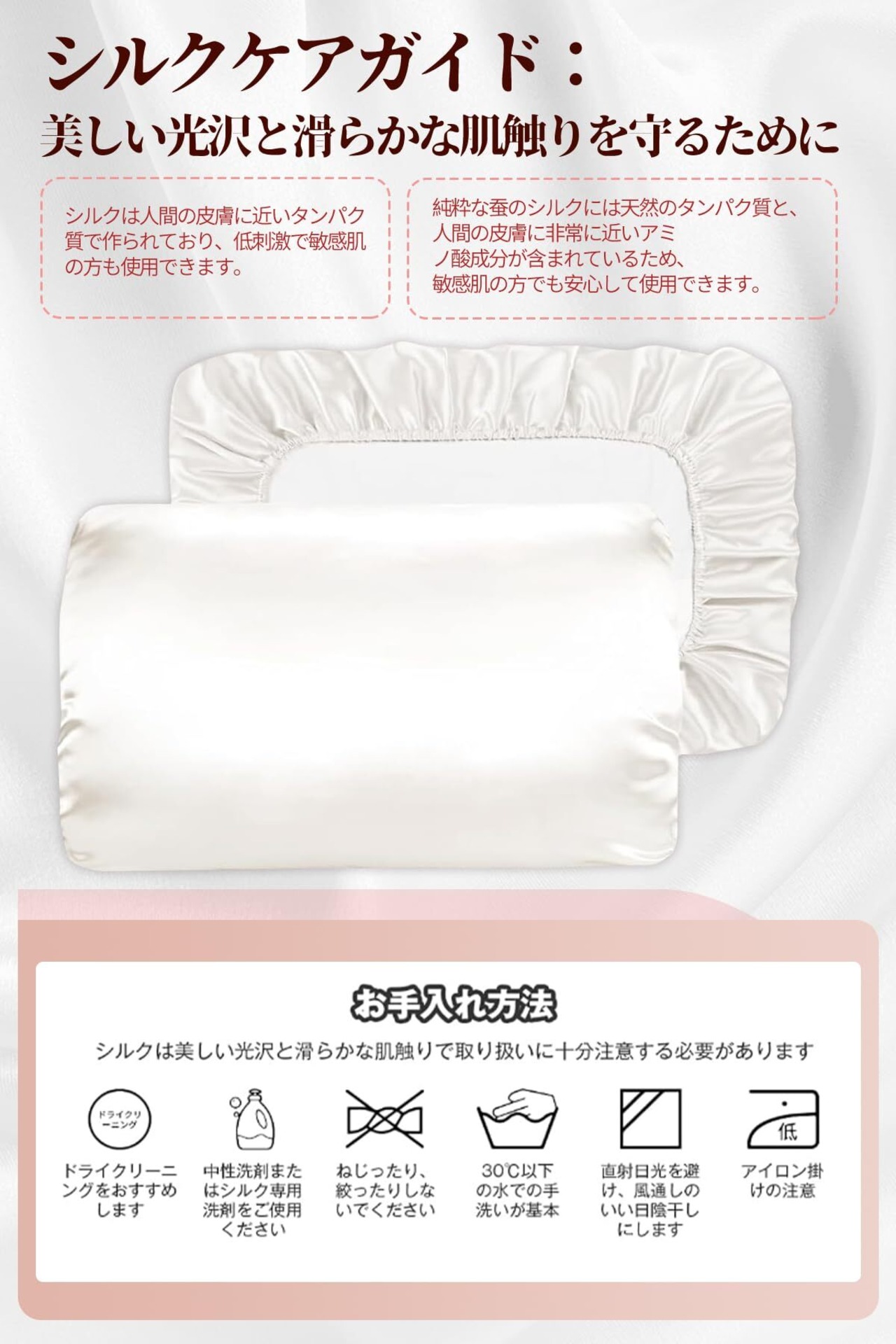 【お手入れ方法】 シルク 枕カバーはドライクリーニング、または中性洗剤やシルク専用洗剤を使用し、約30℃のぬるま湯でやさしく手洗いしてください。直射日光を避け、風通しの良い陰干しをおすすめします。低温で軽くアイロンをかけることで、シルク 枕カバーの美しさと品質を保つことができます。