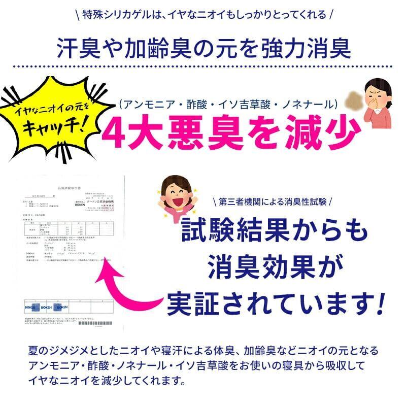 お手入れ方法 お洗濯できます。 吸湿センサーの色が変化しなくても2週間に一度の目安で、天日・布団乾燥機で乾燥してください。 ※天日に干す場合、センサーの裏面を天日に干してください。 ※天気のよい日でも、湿度の高い時は、センサーがブル?に戻らない場合もありますが、吸湿機能は十分に回復しています。 ご注意 生産の工程上、生地の裁断時に中材のシリカゲル(ザラザラした粉)がどうしても商品に付着してしまいます。 ご使用前に一度洗濯されることをおすすめ致します。 シリカゲルは人体に無害ですのでご安心くださいませ。