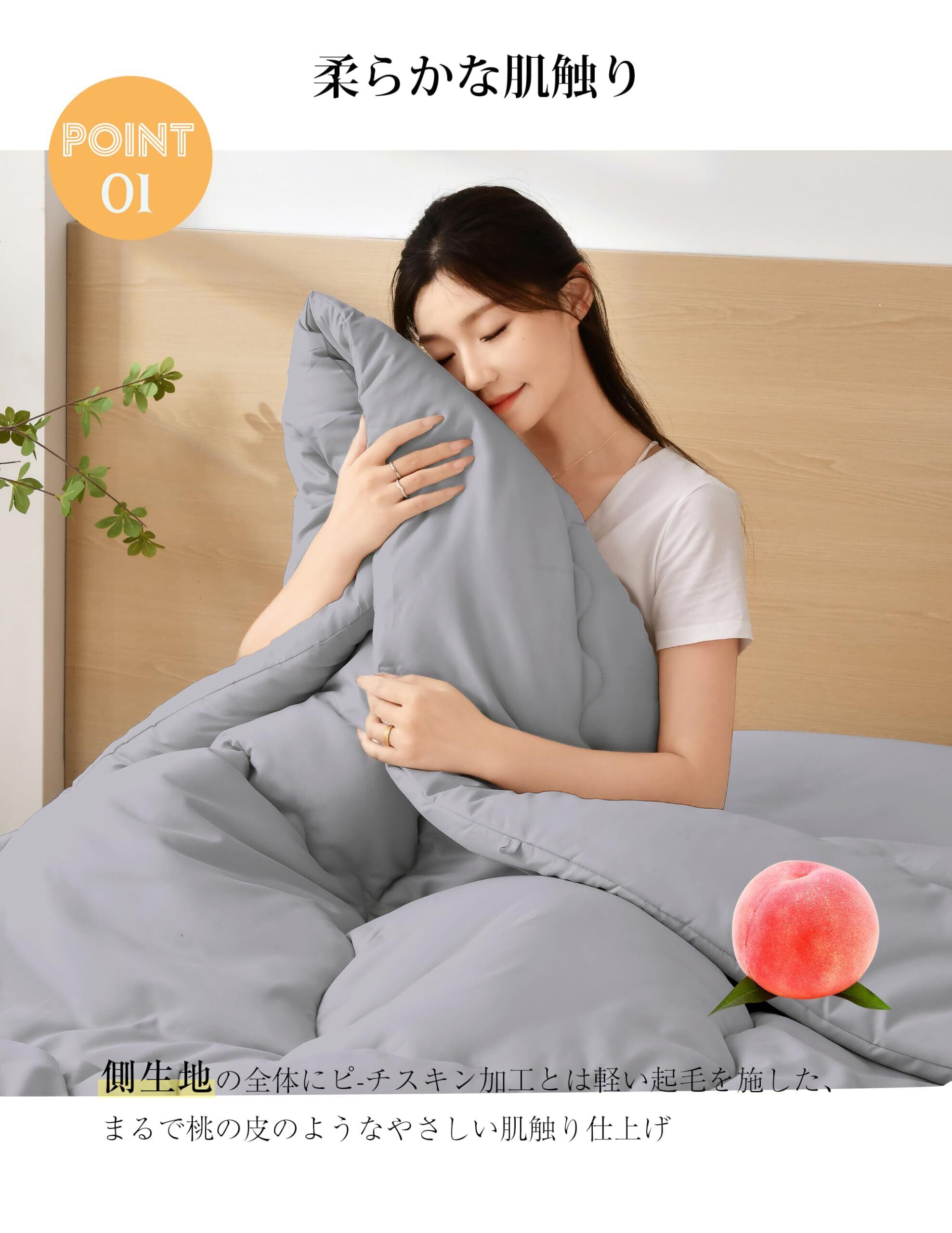 【商品仕様 フワっと軽い】掛け布団サイズ:150x210cm(シングル)/表側の素材:ポリエステル100%(ピーチスキン加工)/中綿の素材:中空構造のポリエステルわた100% 。中綿には綿切れしにくい中空ポリエステル綿を使用しています。アレルギーの原因となるホコリが出にくい素材です。高品質の中空綿は保温性と軽さに優れ、超極細繊維構造が空気をたっぷり含むので、ふんわりと軽く体を包み込み、より快適な寝心地を実現します。女性でも持ち運び楽々!来客用にも最適です。