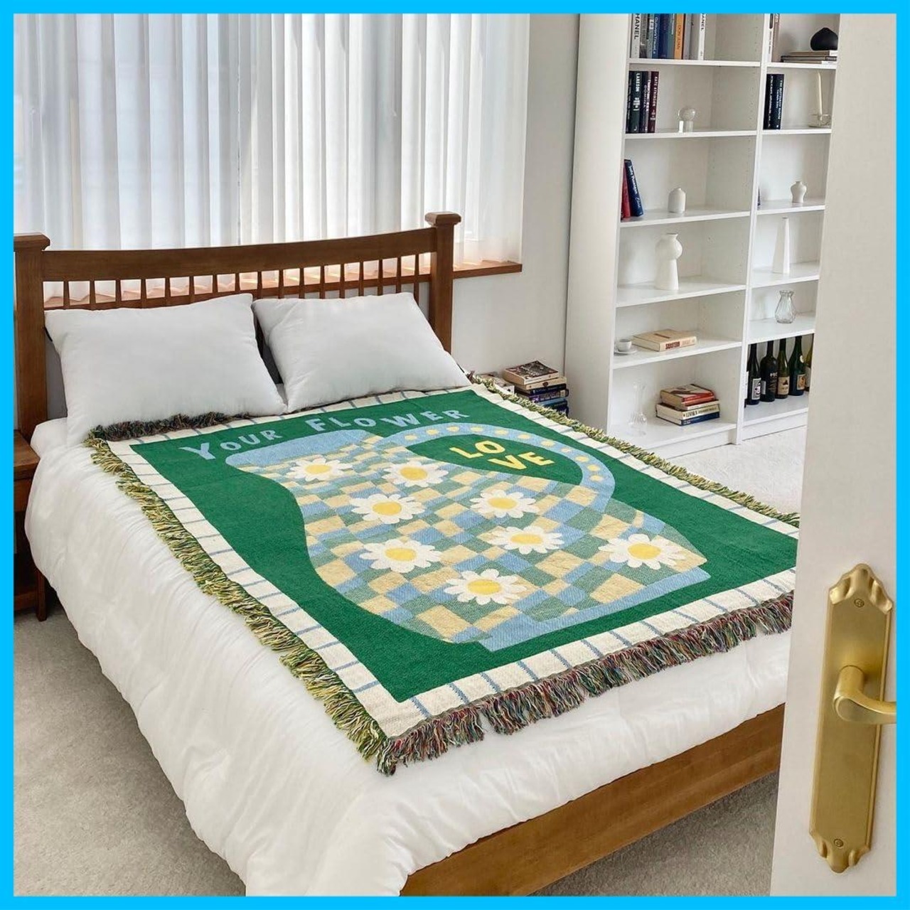 Peel Forest おしゃれ ブランケット ベッドカバー ラグ 北欧,ひざ掛け 花瓶,デイジー,グリーン 130X160cm