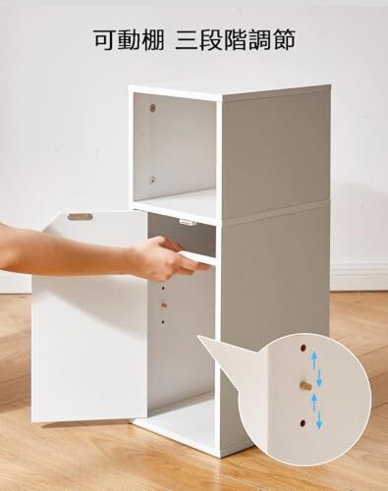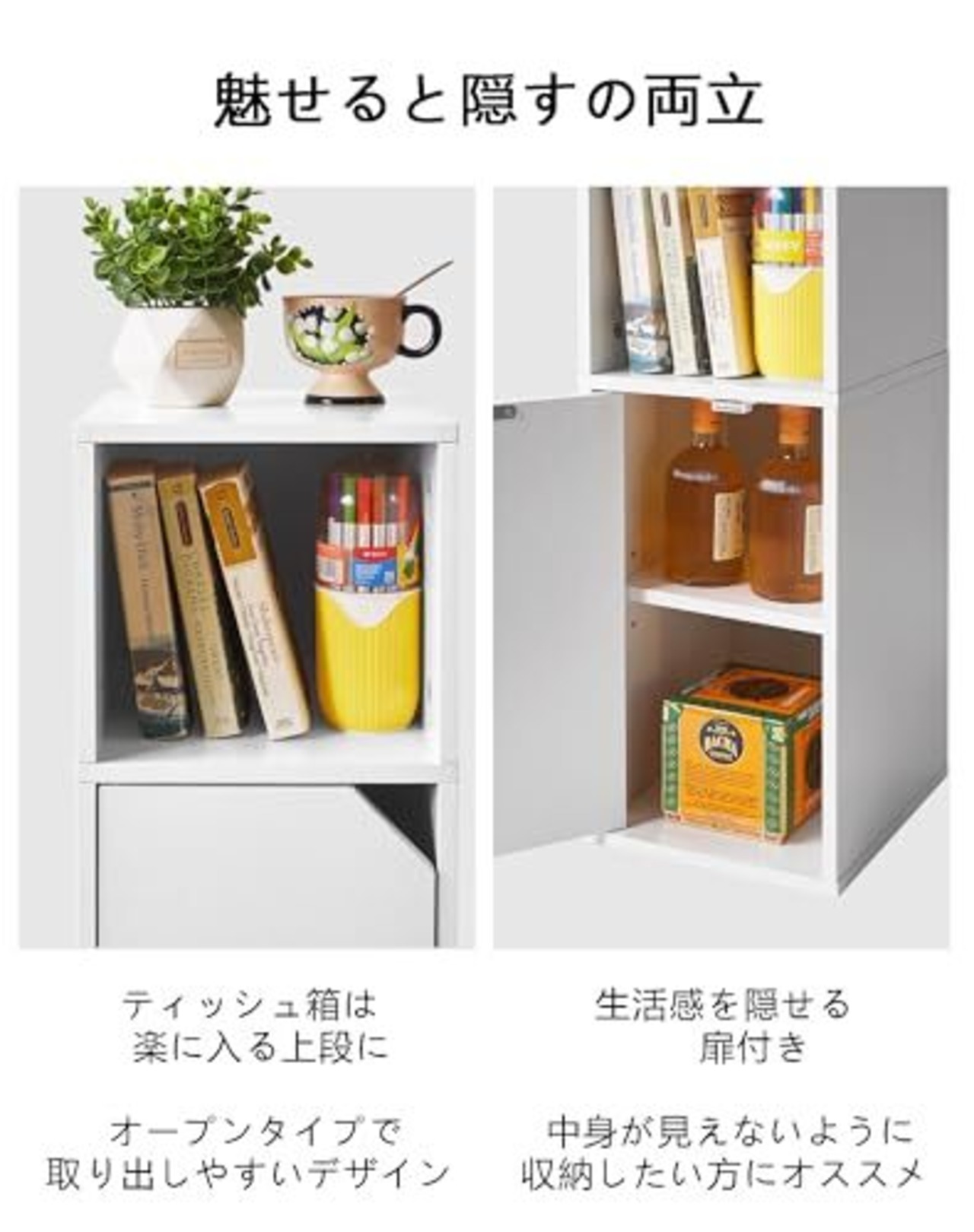 魅せると隠すの両立:上段はラフに文庫文・ティッシュ箱が入れられるオープンな収納スペース。下段は可動棚で、収納したい物に合わせて三段階調節でき、高さのある置物も置けます。さらに扉付きで、生活感を抑えたスッキリ見た目のサイドテーブルとしてお使いいただけます。「見せる」と「隠す」の二種類の収納で、スッキリ片付いた素敵な空間に。