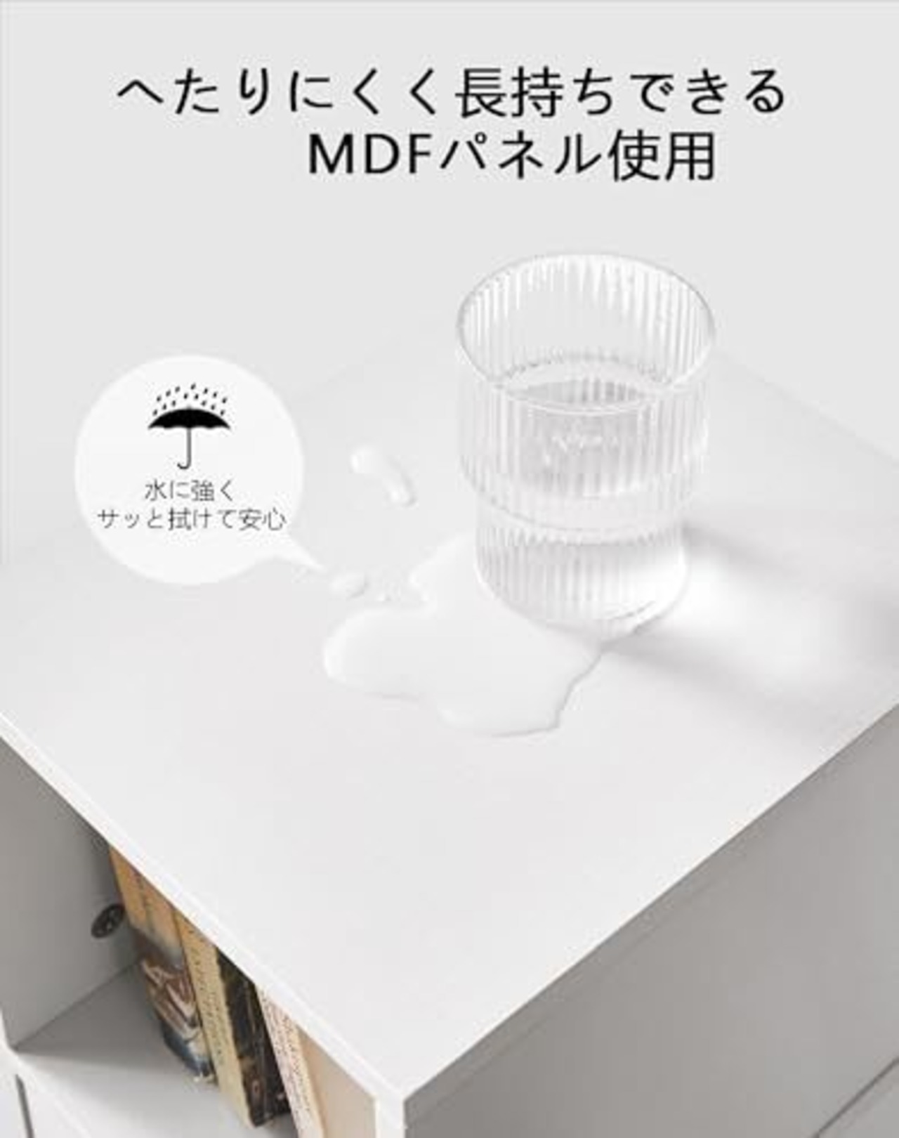しっかりとした造り:へたりにくく長持ちできるMDFパネルなので、水や傷に強く、汚れてもサッと拭き取ってキレイにできます。滑り止めフットパッド付き、床を傷から守ります。耐荷重:[全体]約20kg。