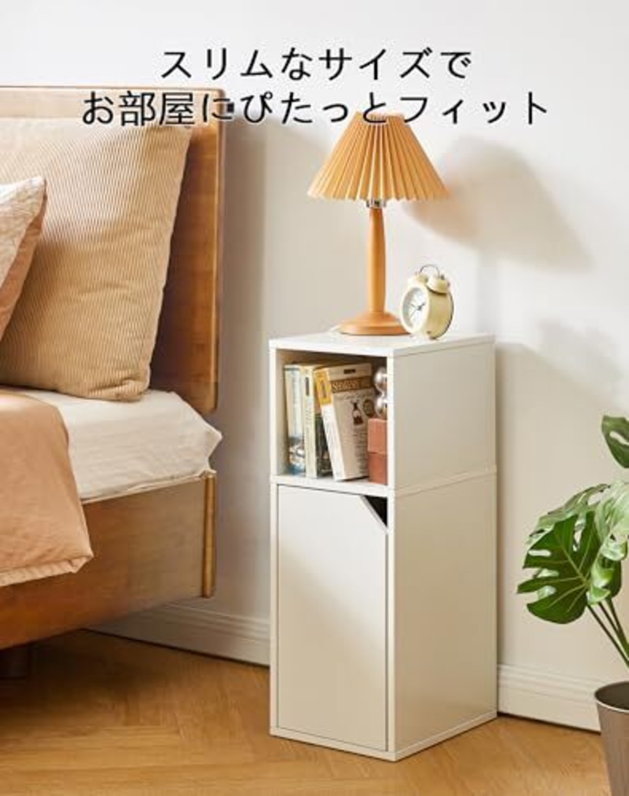 【在庫セール】YMYNY ナイトテーブル サイドテーブル スリム 扉付き 木製 MDFボード 組み立て簡単 コンパクト ナイトスタンド ソファテーブル 隙間収納 小物収納 寝室 玄関 棚 卓下 〔左開き〕 ホワイト HST016W