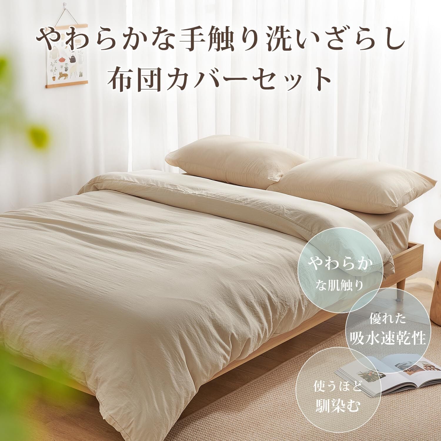 布団カバー シングル 3点セット 寝具カバーセット 洋式ベッド・和式布団兼用 洗いざらし シワ加工 水洗い やわらか (掛け布団カバー ボックスシーツ 枕カバー)吸水速乾 丸洗いOK 肌に優しい 洗える 無地 シンプル オールシーズン (通年タイプ・アイボリー, シングル・3点セット)
