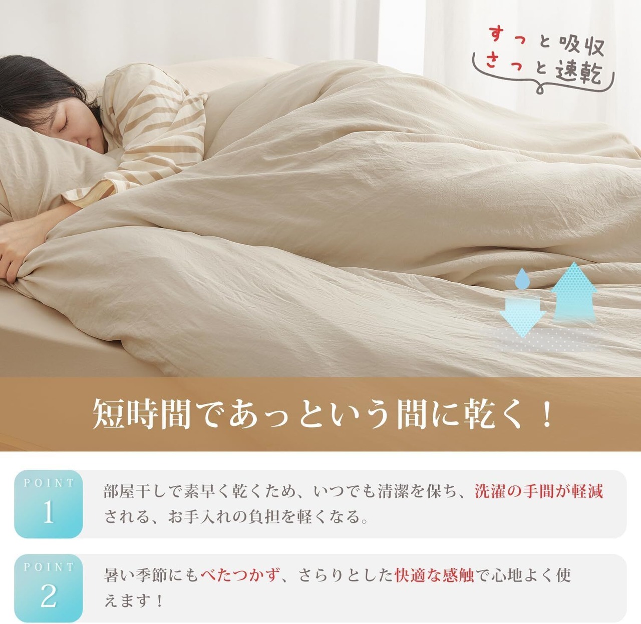 <通気性と速乾性>: 素材:ポリエステル100%。通気性が高いため、寝具の中で湿気がこもりにくく、快適な寝心地を提供してくれます。この布団カバーセットは速乾性も優れています。洗濯後に素早く乾くため、洗濯の手間を軽減できますし、清潔さを保ちやすくなります。