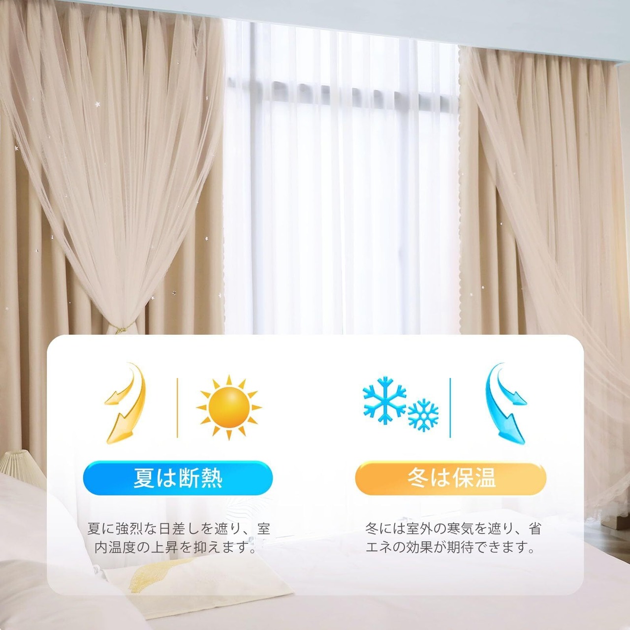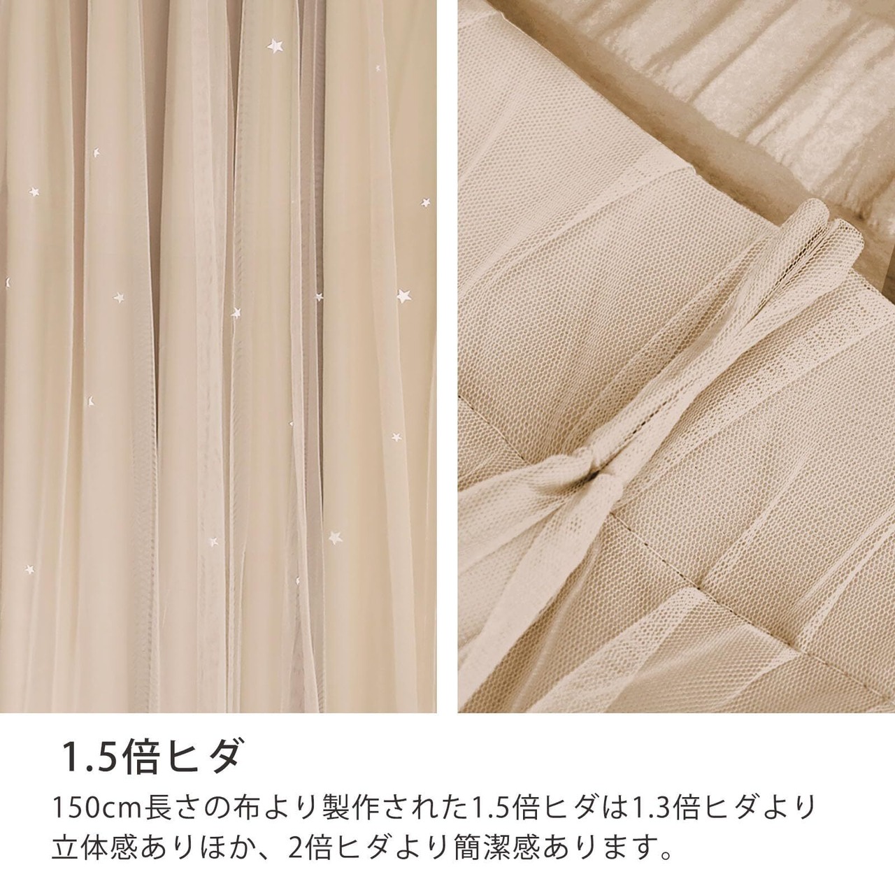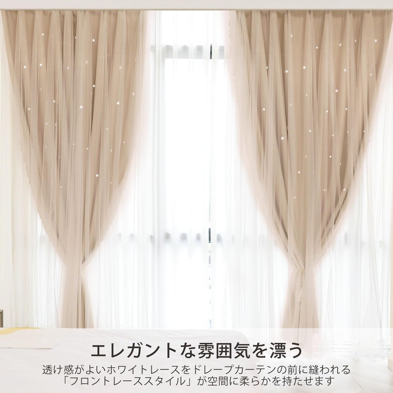 カーテン 姫系 遮光 レースカーテン付き 2枚組 丈180cm×幅100cm 一体型カーテン 二重 星柄 おしゃれ 厚手 フック付き タッセル付き 取付簡単 すぐ使える アジャスター付き 遮熱 保温 小窓/出窓用 掃き出し窓 腰窓 子供部屋 女の子 幼稚園 洗濯可能 ベージュ【両開き】JOLLYVOGUE