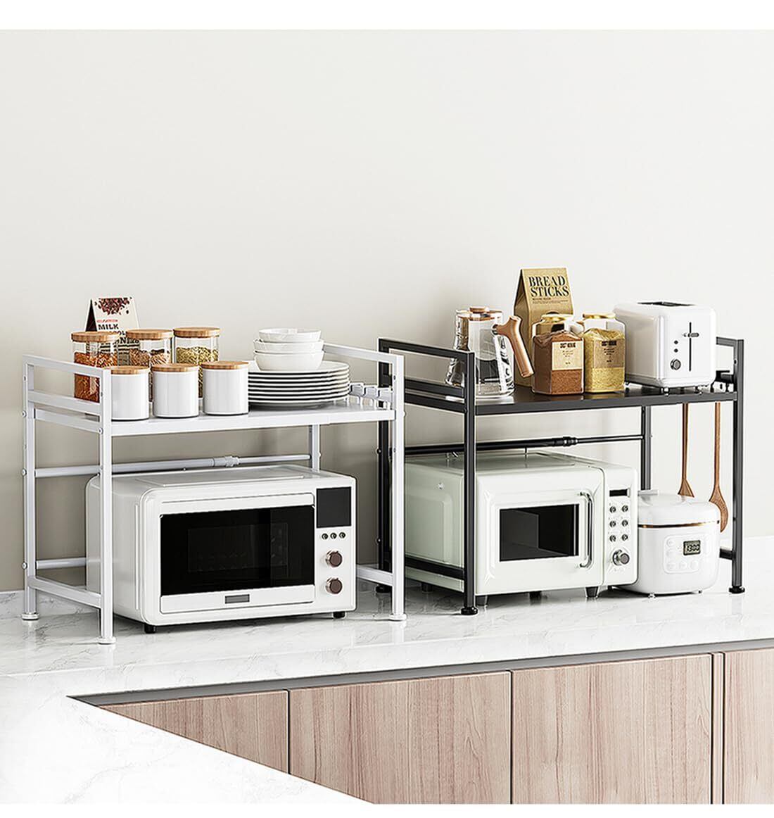 【高さ3段階調節可・幅伸縮式】:収納ラックの幅の伸縮範囲は40cm~60 cmの間で無段階に調節でき、可動棚板は約5.5cm間隔で3段階で高さ調節可能で、ニーズに合わせて自由にアレンジできます。電子レンジやオーブン等の小家電に適用し、調味用品、キッチン用品を簡単に綺麗に収納できます。上層の両側は手すり設計を採用し、置物倒れ防止する上、小物を掛けるのに便利なフックが5個付属。雑巾や調理道具など吊り下げ収納できます。キッチンのスペースをよくご活用いただけます。
