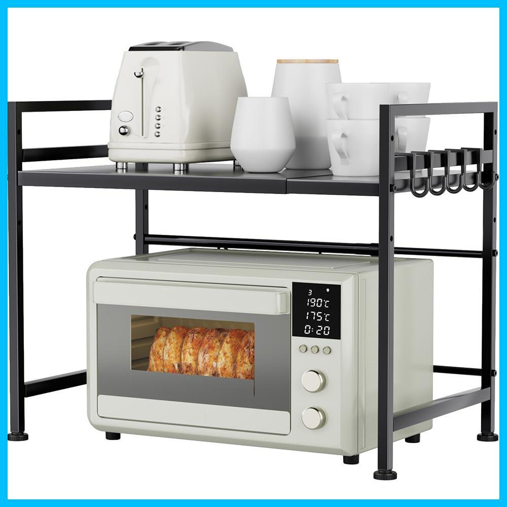 【数量限定】レンジ上ラック トースターラック キッチン収納 伸縮式 幅(40-60cm)棚板高さ調節可 電子レンジ 台 耐荷重50kg フック5つ付き お洒落 収納ラック