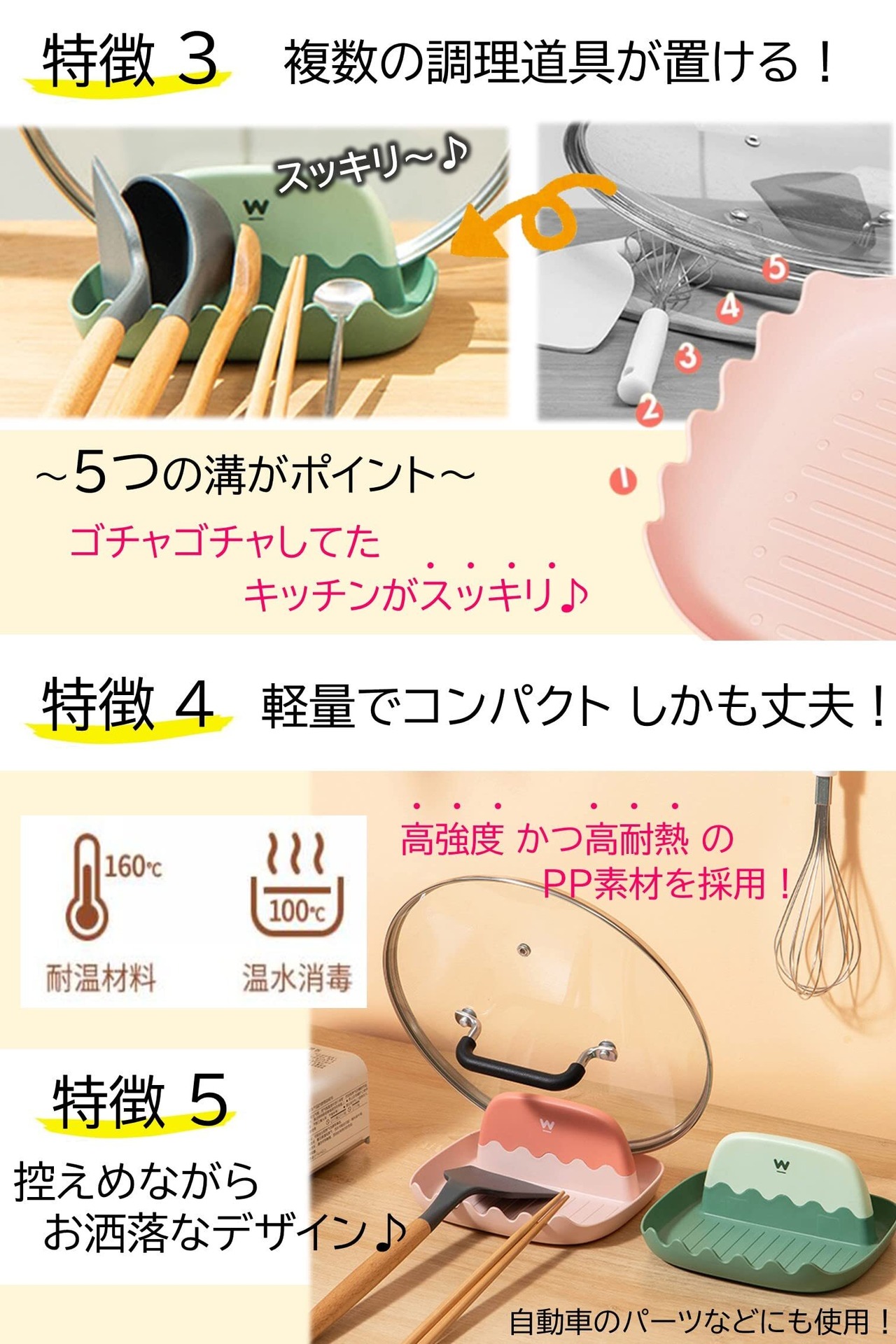 【調理のお役立ちアイテム】調理中に一時置きしておきたいお鍋の蓋やお玉、菜箸などをまとめて置けるお玉置き(鍋蓋&キッチンツールスタンド)。このおたま置きにまとめて収納できるので省スペースでキッチンを広く使うことができます。調理中だけでなく、洗い終わった調理アイテムを乾燥させるスタンドとして利用でき、ご家族でお鍋を囲むときの卓上でも活躍してくれます。