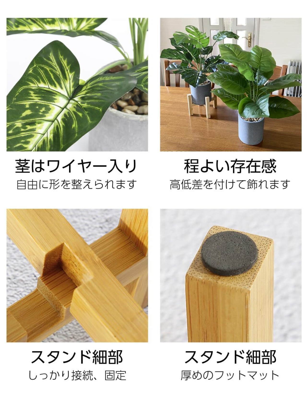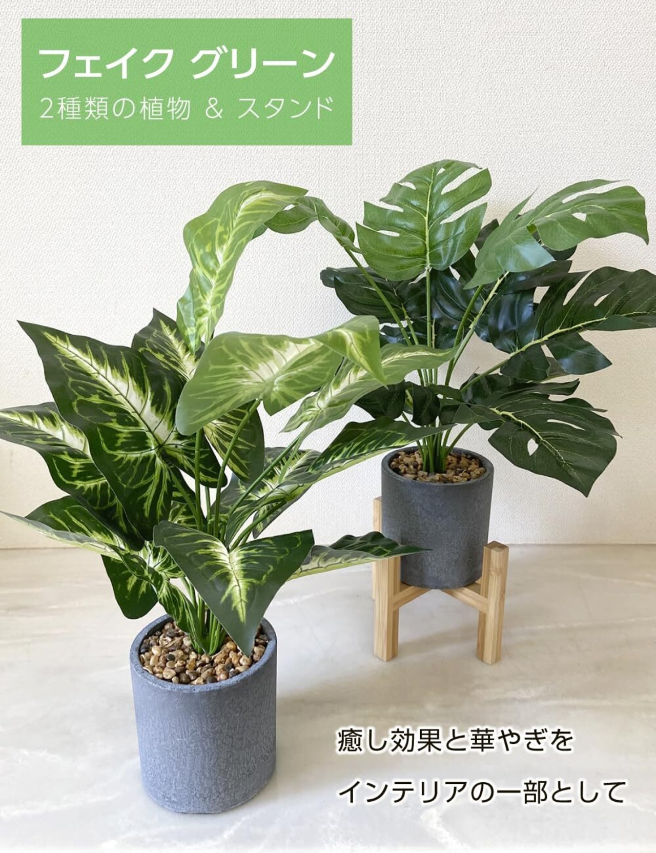 【インテリアの一部として】人工観葉植物2種とプランタースタンド1個のセット商品です。台を使って高低差を出して並べて飾っても良し、別々に飾っても存在感があります。また、スタンドは生の植物にも使っていただけます。
