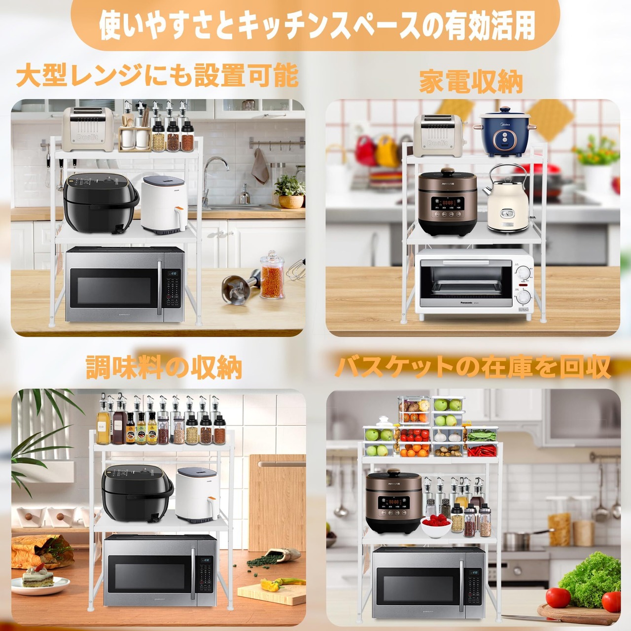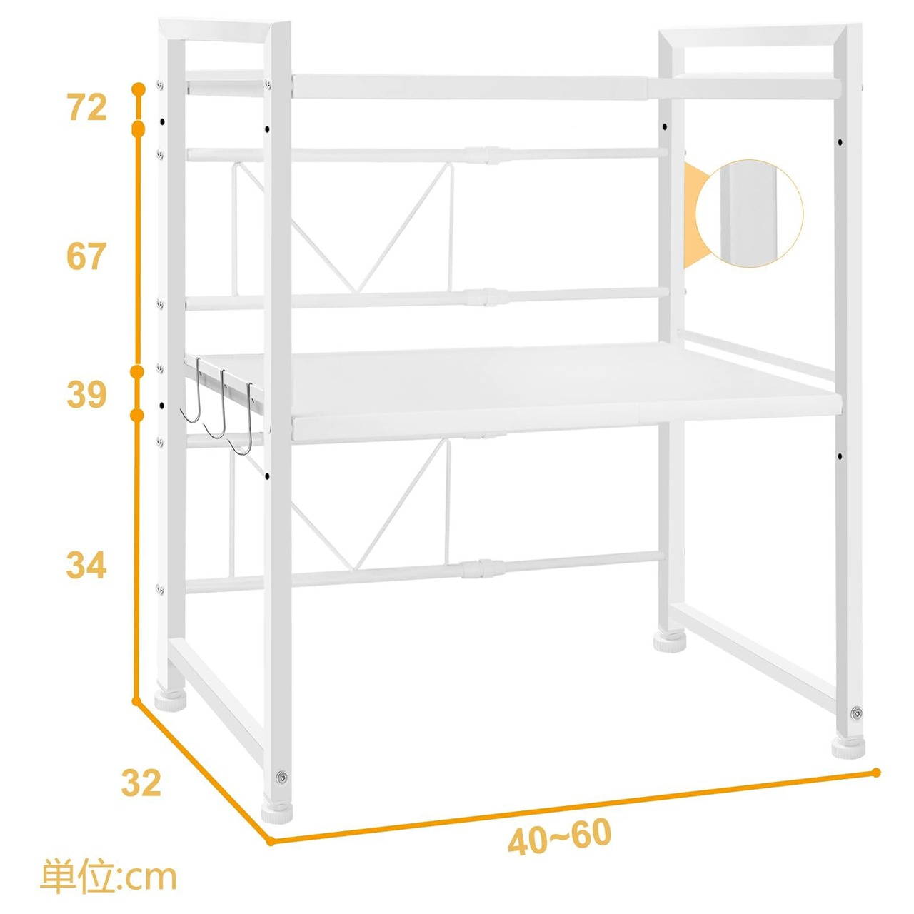 【製品仕様】商品サイズ:(約)幅40~60cmx奥行32cmx高さ78cm、組み立て必要。【素材】上質なスチールを採用しており、高温で焼付塗装を施しており。キッチンラックの収納空間は大きく増加できます!電子レンジやその他のキッチン用品に最適です。