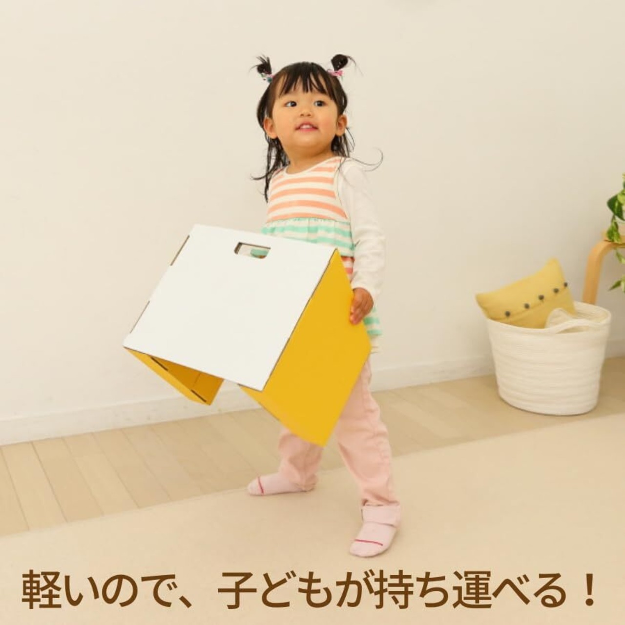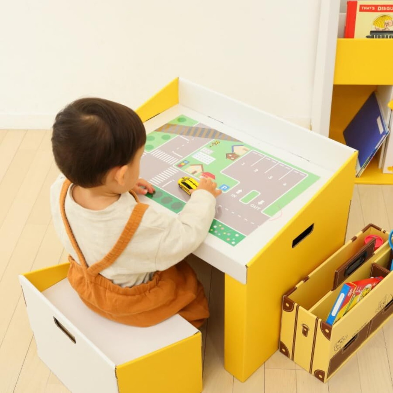 お子さまの意欲を引き出す「専用」スペースだから、お絵描き・工作・ワーク遊びにもっと熱中できる! 段ボール製だから、お手頃価格&リサイクルできて、幼児期の一時的な使用におすすめ。 パワーアップして新登場! より夢中になって遊べるように「ひらがな練習だけではなく、 ごっこ遊びや数字練習もできる4種類のデスクマット」付きに! さらに、子どもが好きなビタミンカラー「イエロー」に加え、お部屋に合わせやすい「ブラウン」も登場! 2つのカラーから選べるようになりました。 【特長】 ・幼児の体のサイズに合わせた仕様、簡単には倒れない安定感のあるしっかりとした形状・重量感。 ・耐荷重デスク約20kg、チェア約30kgまで対応の、丈夫な段ボール素材のデスク&チェア。 ・デスクは、3辺に立ち上がりがあり、クレヨンや鉛筆などが下に落ちにくい設計。 ・机上には「透明PETシート」がセットしてあり、字が書きやすくデスクが汚れにくい。 ※「透明PETシート」の下に入れている「デスクマット」は取り外し可能なので、 大きくなって外したり他の好きなキャラクターのシートに変えて長く使用できます。 ・チェアは、子どもが座っているときに後ろに倒れにくい背もたれとサイド付き。 ・段ボール製だから、軽くて子どもでも扱いやすい。 ※お子さまが持ち運ぶときは、しっかり歩けるようになってから。おうちの方が見守る中でお願いいたします。 ※撮影小物は付きません。