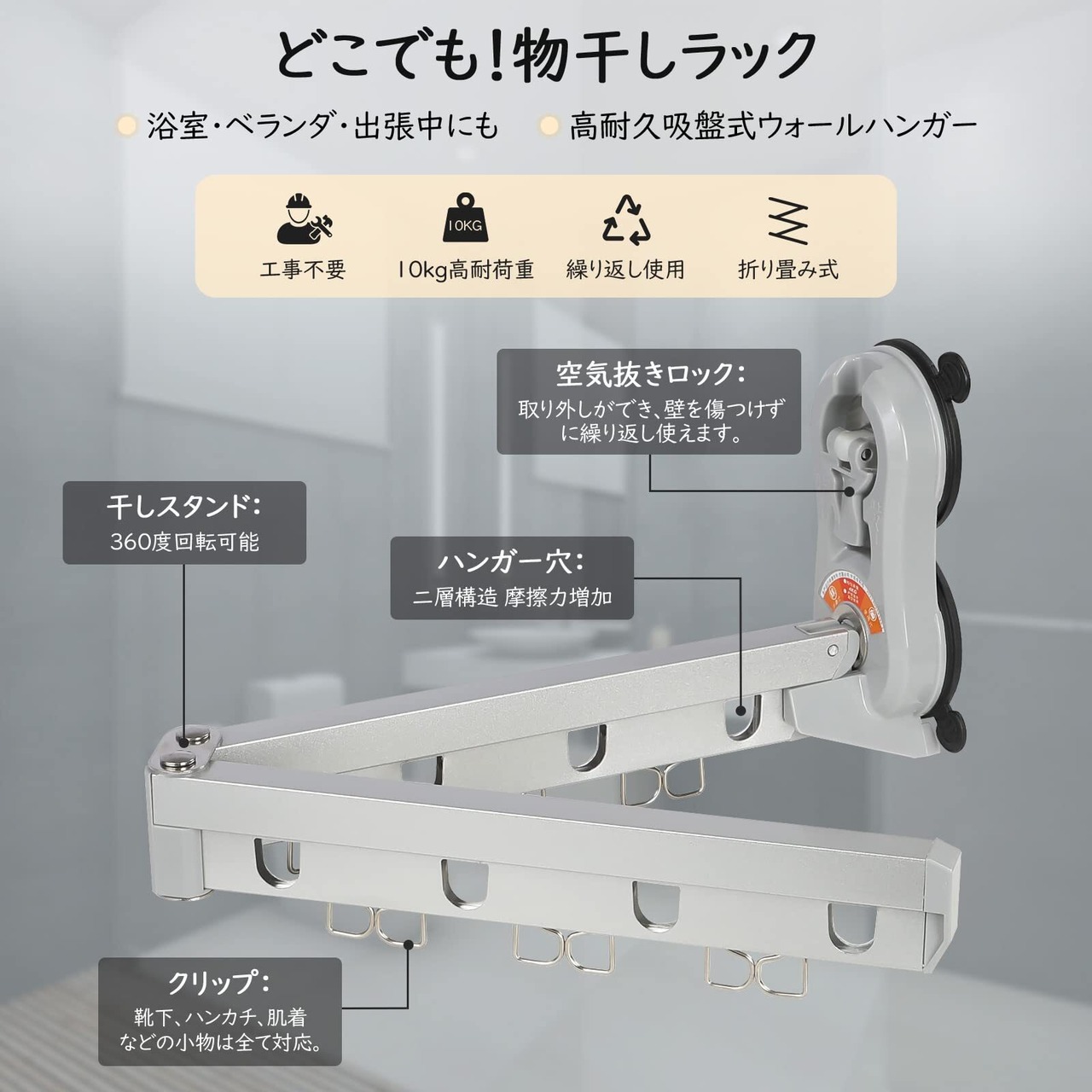 【用途が広い】コンパクト&軽量設計で持ち運びに便利な点も特徴です。壁面のデッドスペースを有効活用し、すっきりとした空間を保てます。吸盤式なので簡単に取り付け、取り外しができ、壁を傷つけずに繰り返し使えます。強吸着力のため、ガラスやタイルなどの壁面で使用可能。賃貸物件やバルコニーがない場所でも手軽に使用できます。旅行時、ホテルのバスルームやルームで、ガラスに貼り付け、衣類を掛けたり、衣類を乾かしたりできます!