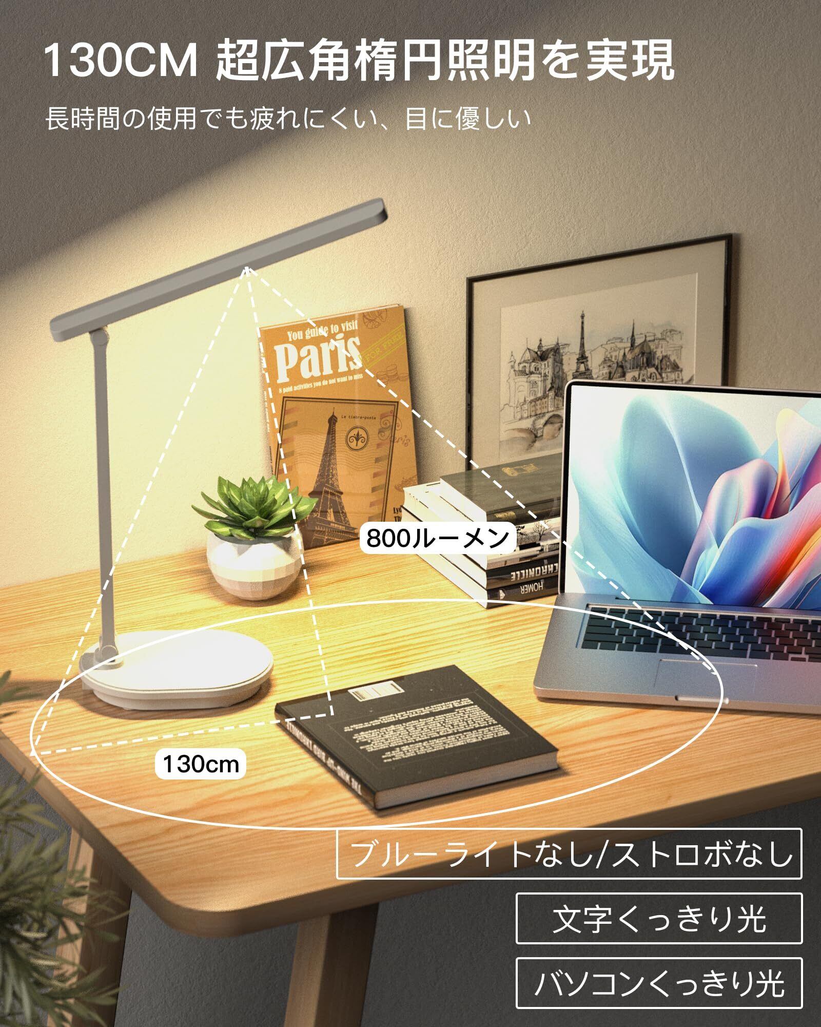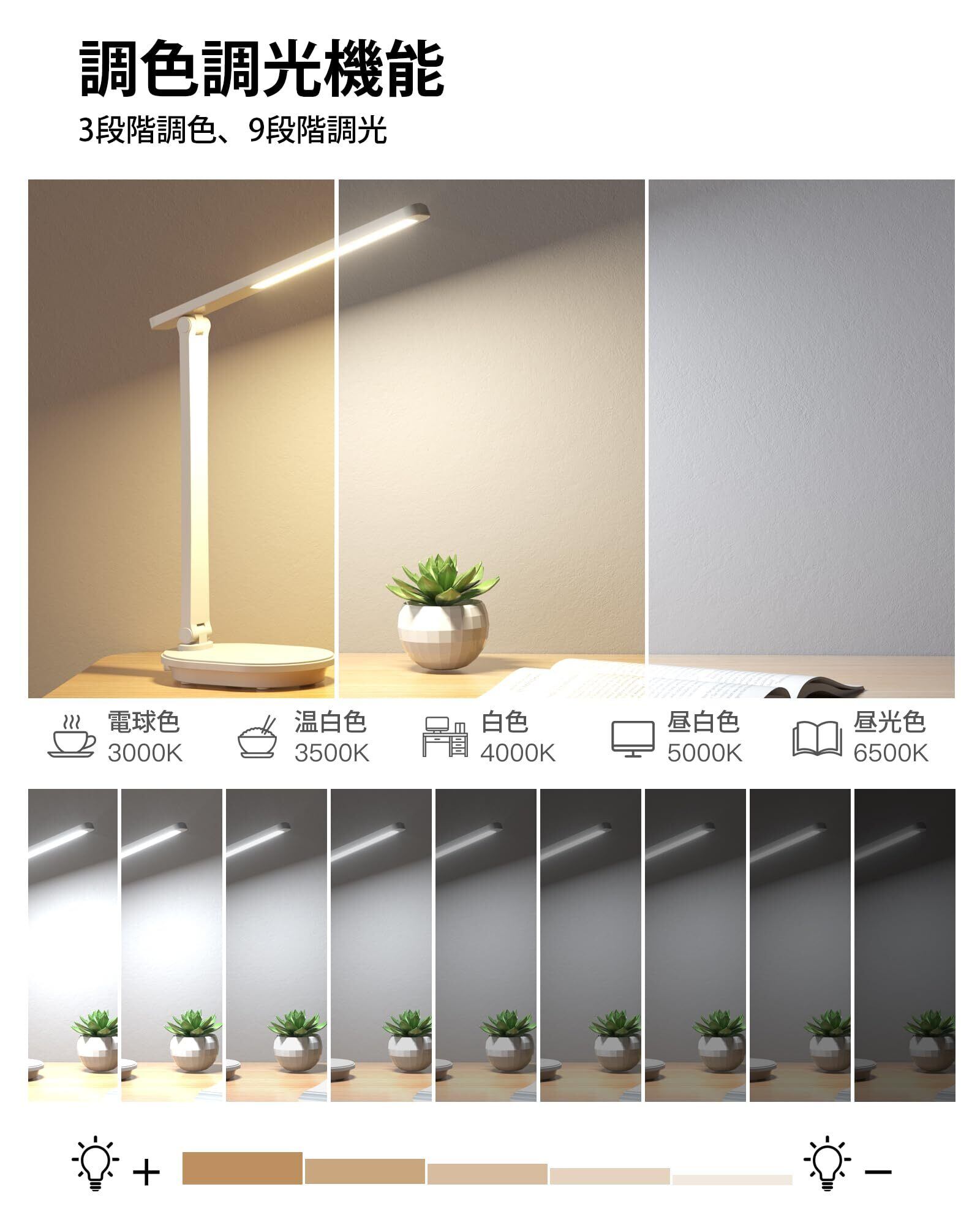 【9段階調光・3段階調色スタンドライト】2024年の新型LEDデスクライトて、お好みの明るさを9段階に調節できます。読書灯は読書、仕事、リラックスタイムなどに適していっます。シーンに合わせて、最適な照明を自由に設定できる。勉強 ライトとして、目に優しく、長時間使っても快適な明るさを見つけることができる電気台卓上です。そして、スタンドライトは電球色(3000 K)、温白色(4500 K)、昼光色(6000 K)の3種類の色温度を選択することができます。そして、デスクライトッチに軽く触れるだけで点灯操作ができます。ライト ledのキーを長押しすると電気を消すことができます。これは、「+」と「-」をタップしたり長押ししたりすることで簡単に明るさを調整できる卓上ライトです。仕事でも休憩でも、さまざまなシーンに最適な照明環境を備えたデスク 用 ライトです。