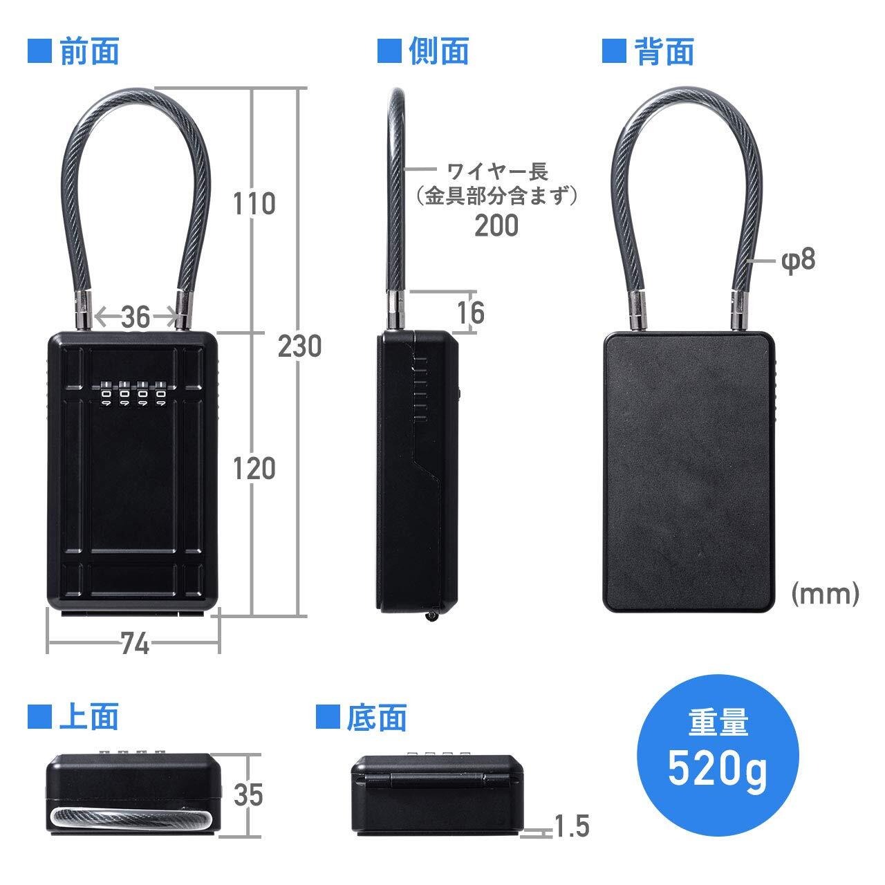 サンワダイレクト キーボックス ダイヤル式 4桁 ワイヤー長20cm 大型 鍵収納 盗難防止 200-SL065BK