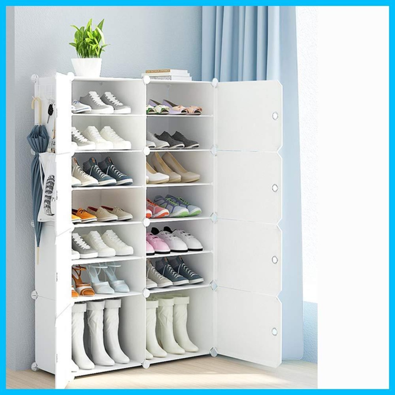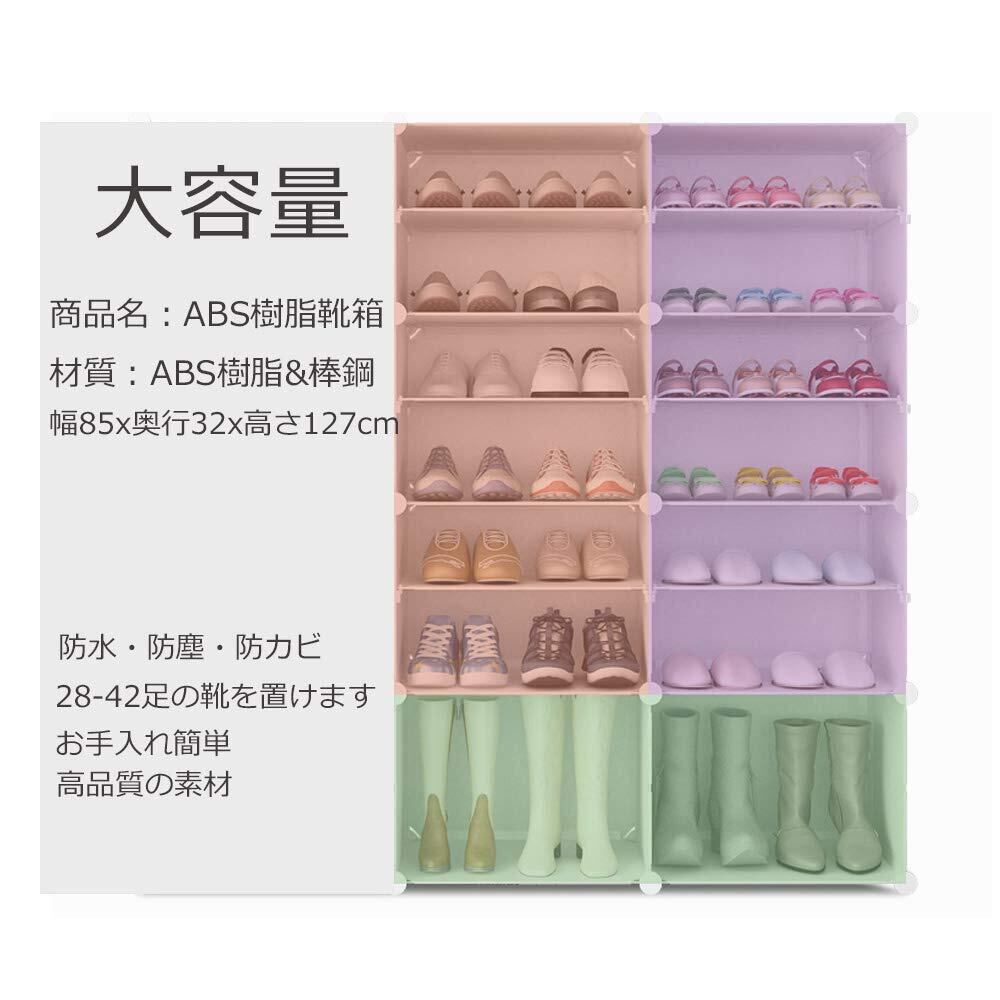 【省スペース&大容量】サイズ: 85cm(幅)× 32cm(奥行)×127cm(高さ)材質:本体/樹脂、柱/厚鉄パイプ。28 ~ 42足まで対応できます。ルービックキューブはそれぞれ二重構造になっていて、間の仕切りが取り外し可能になっているため、ブーツやハイヒールなどを収納できるスペースがあり、バッグやシューズボックスなどを収納できます。