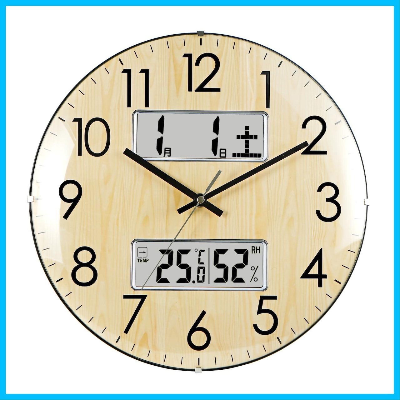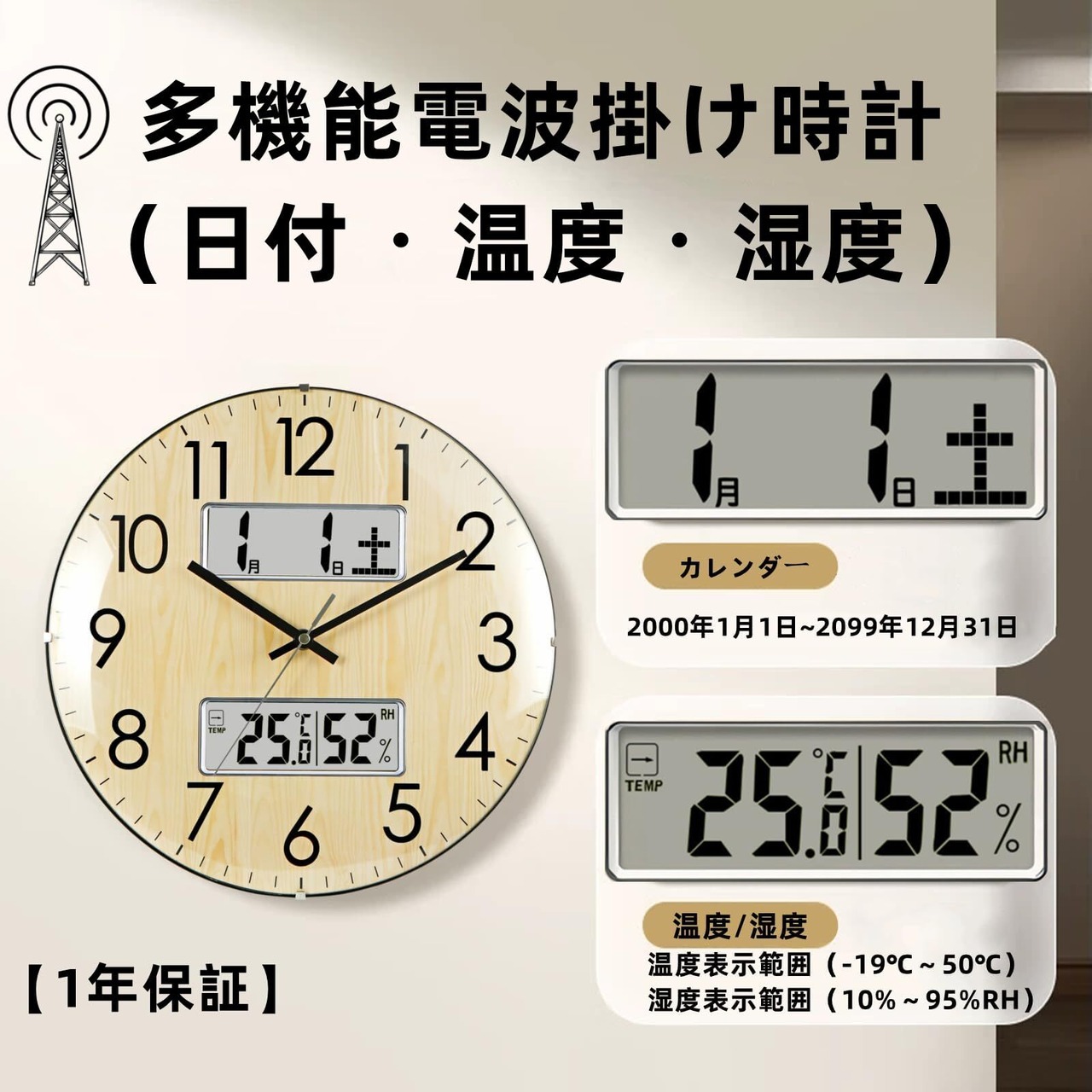 【在庫セール】掛け時計 電波時計 温度・湿度・日付・曜日表示 33cm直径 アナログ 夜間秒針止まり(22時~6時) 静音 球面ガラス ナチュラル