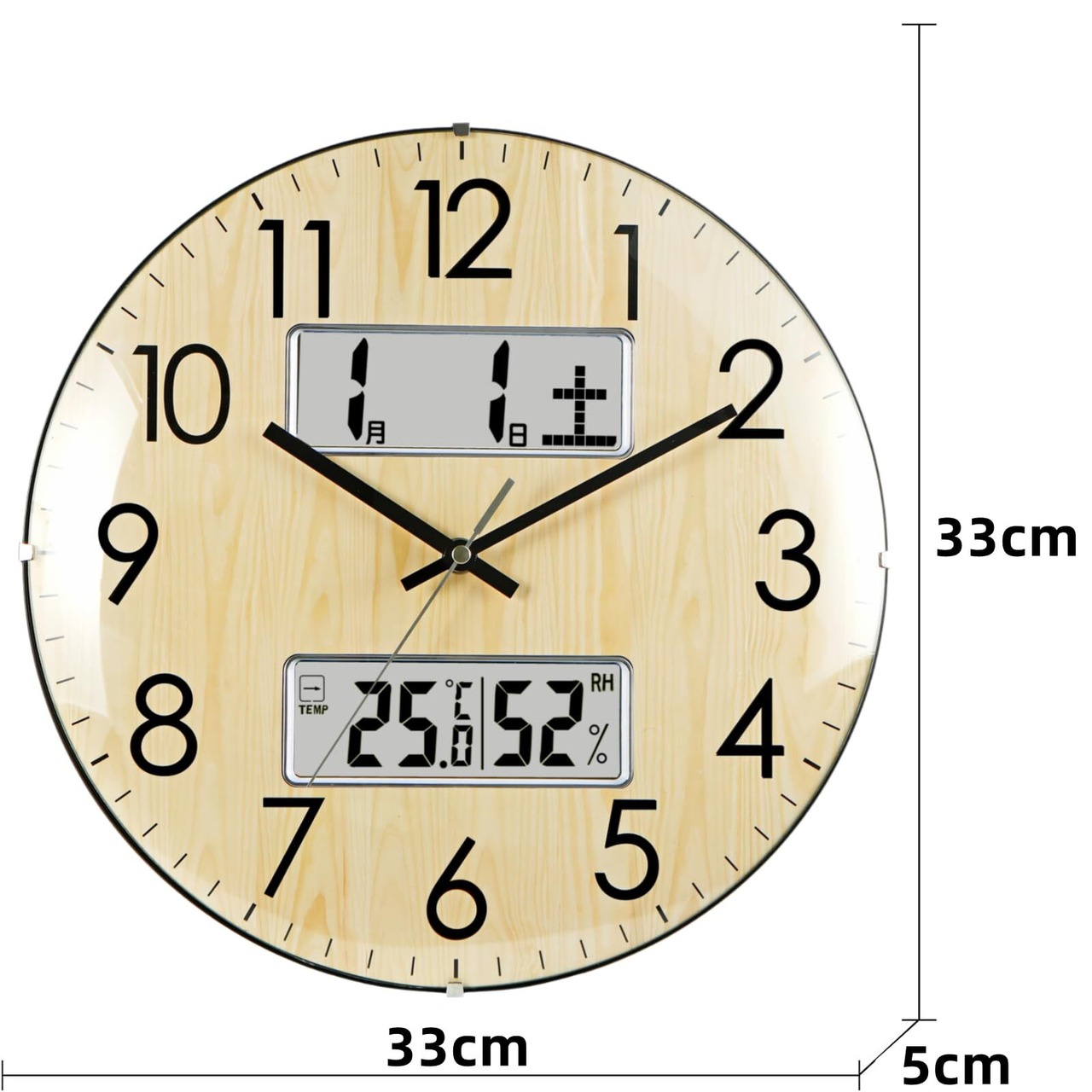 掛け時計 電波時計 温度・湿度・日付・曜日表示 33cm直径 アナログ 夜間秒針止まり(22時~6時) 静音 球面ガラス ナチュラル