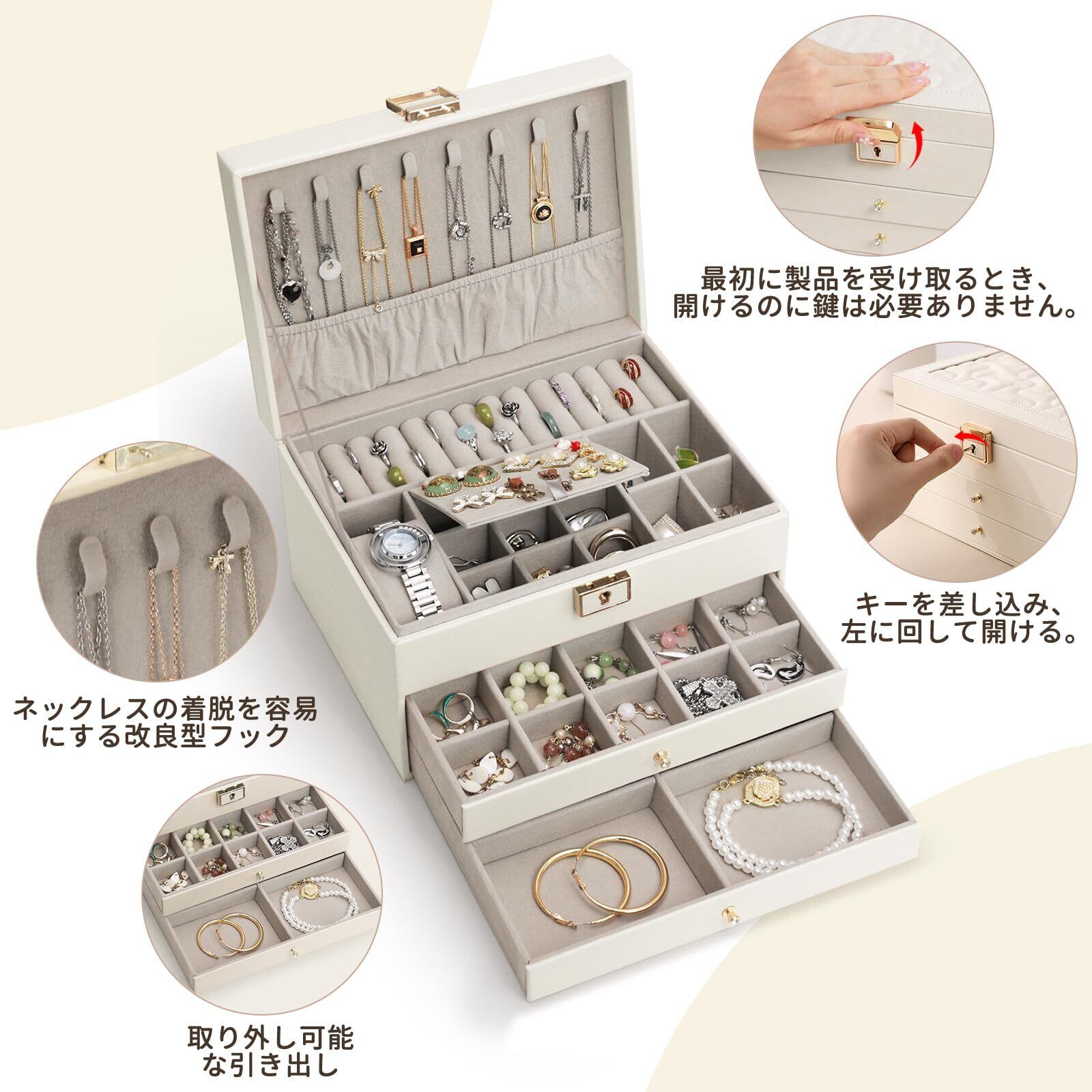 【数量限定】Yoobao アクセサリーケース おしゃれ 引き出しジュエリーボックス 大容量 鍵付き 3層アクセサリー収納 PUレザー 指輪ケース ネックレス イヤリング ピアス ブレスレットなど小物入れ 着脱式の仕切り付き 宝石箱 女性 jewelry box organizer レディース 母の日 クリスマス 結婚式 記念日 誕生日 プレゼント用 (ホワイト)
