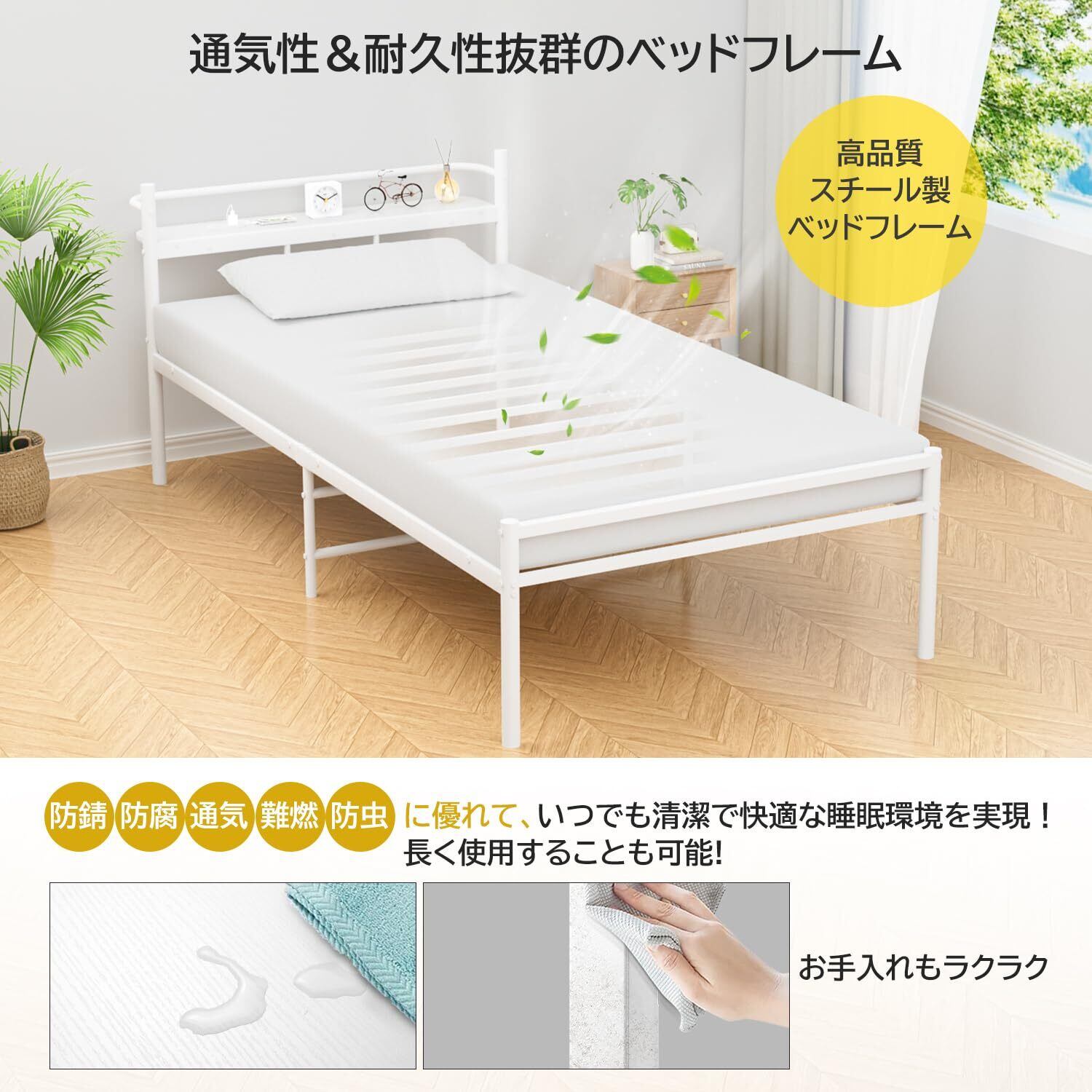 【在庫セール】PRTONE ベッドフレーム ベッド シングル パイプベッド 宮棚 2口コンセント 耐荷重300Kg シングルベッド 安定 静音 頑丈 通気 耐久 べっどふれーむ ベッド下30cm収納空間 bed frame single 組立簡単 工具付き 一人暮らし 狭い空間向け 組み立て式ベッド 白