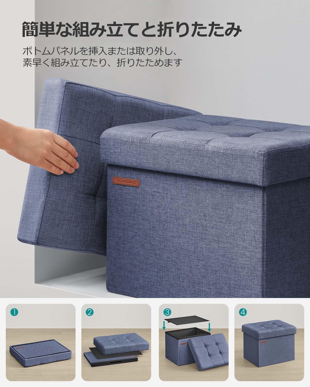 【多機能デザイン】脚台としても使える便利な収納スツールです。玄関で靴を履く時の腰掛けや、突然の来客時の椅子として活用できます。また、お子様の整理習慣を育むためにもおすすめです。おもちゃ、雑誌、衣類などの生活用品を整理整頓して収納することができ、スペースをきれいに整えます。ご注意: 製品の材質により、開封時に特有のにおいがする場合がございます。風通しの良い場所で1~3日程度放置すると自然になくなりますので、予めご了承ください。