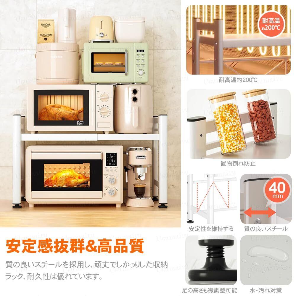 レンジ上ラック トースター レンジラック伸縮式 幅(39-65cm) 上下調節可能 棚板高さ調節 耐荷重75kg シンク上キッチン収納 ガタツキ防止 フック6個付き キッチン収納 省スペース 組立簡単 多用途(ホワイト)