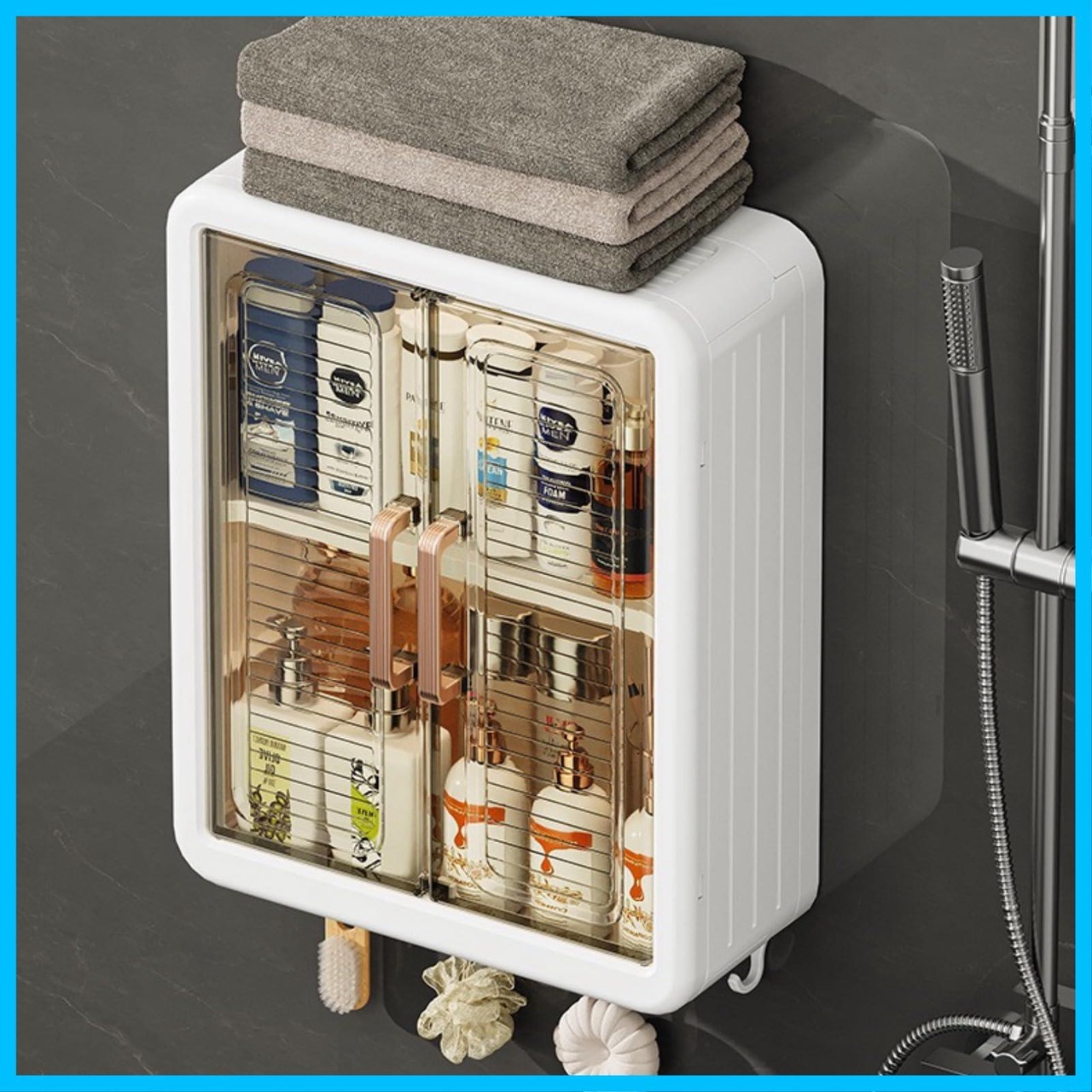 【人気商品】トイレ収納 洗面所収納 キャビネット マグネットダブルドア フック5つ付き 密封防水 壁掛け収納棚 寝室 浴室 収納ボックス 壁穴開けない 小物入れ