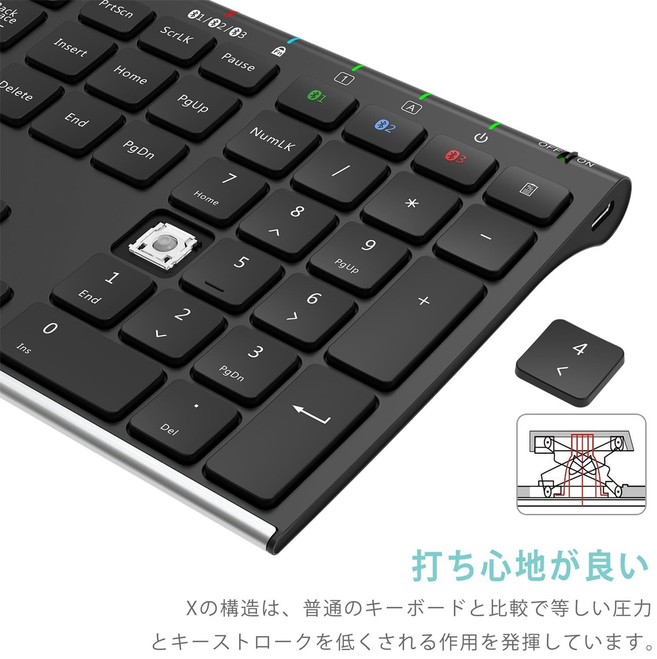 【人間工学設計】ステンレススチールの素材が頑丈な印象を与え、薄型キー、フルサイズのキー、矢印キー、テンキー、ショットカットキー付きで快適なタイピングが出来ます。