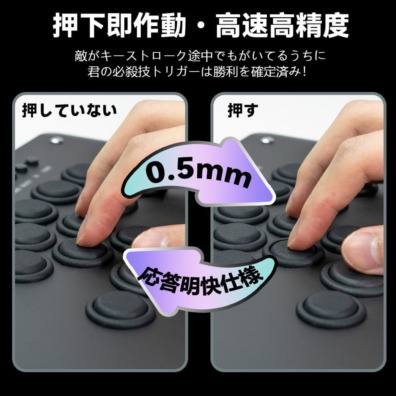 【格闘ゲーマー新たな定番・0.5mm新体験】 私たちが独自開発した全く新しい「0.5mm超高速トリガー霞軸」は、TIKITAKAだけが提供する独占的な軸体で、極限のパフォーマンスを追求するために設計されています。当初、霞軸に似た超短ストローク軸を搭載した高級コントローラーの市場価格は、一般的に35,000円以上でした。格闘ゲームに対する私たちの理解に基づき、霞軸のトリガー距離は極めて短い0.5mmに設定され、1.5mmの総ストローク設計と組み合わせることで、軽くキーを触れるだけで反応し、極限の反応速度を実現します。ショートストローク設計により、すべての操作がキビキビと決まり、激しい対戦時における極端な手速の要求にも安定して対応可能です。35gfの軽やかな押下圧設計は、プロ選手とプレイヤーによるテストで検証済みで、軽快なトリガー感を提供しながら、誤操作率を効果的に低減します。この軸体は、極限のスピードを追求する上級者や熟練プレイヤーに優先的に選ばれるものです。超短ストローク設計を採用し、極限の反応速度を求めるプレイヤーに特化。極限の操作を可能にします。0.5mmの超短ストローク設計と35gfの黄金のトリガー力調整により、普段のコンボ練習から高強度のランクマッチまで、超高速のトリガー速度と雲のような押し心地をします。