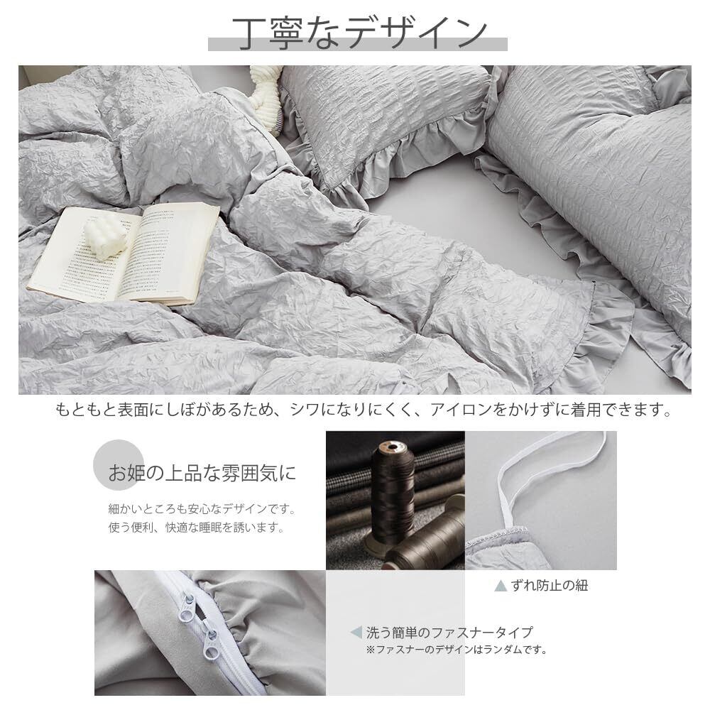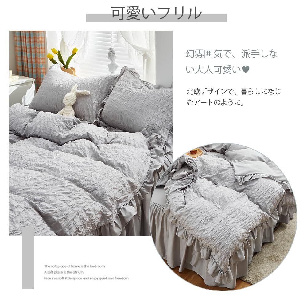布団カバー 3点セット 4点セット フリル付き布団カバー 寝具カバー 洋式・和式兼用 ベッドカバー 掛け布団カバー ボックスシーツ 枕カバー シーツカバー 肌に優しい ピーチスキン加工 北欧風 四季通用 (シアサッカーライトグレー, セミダブル)