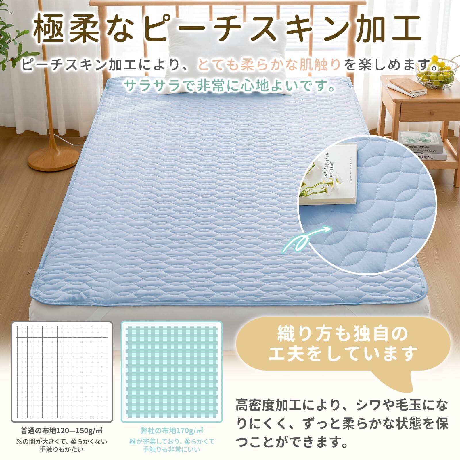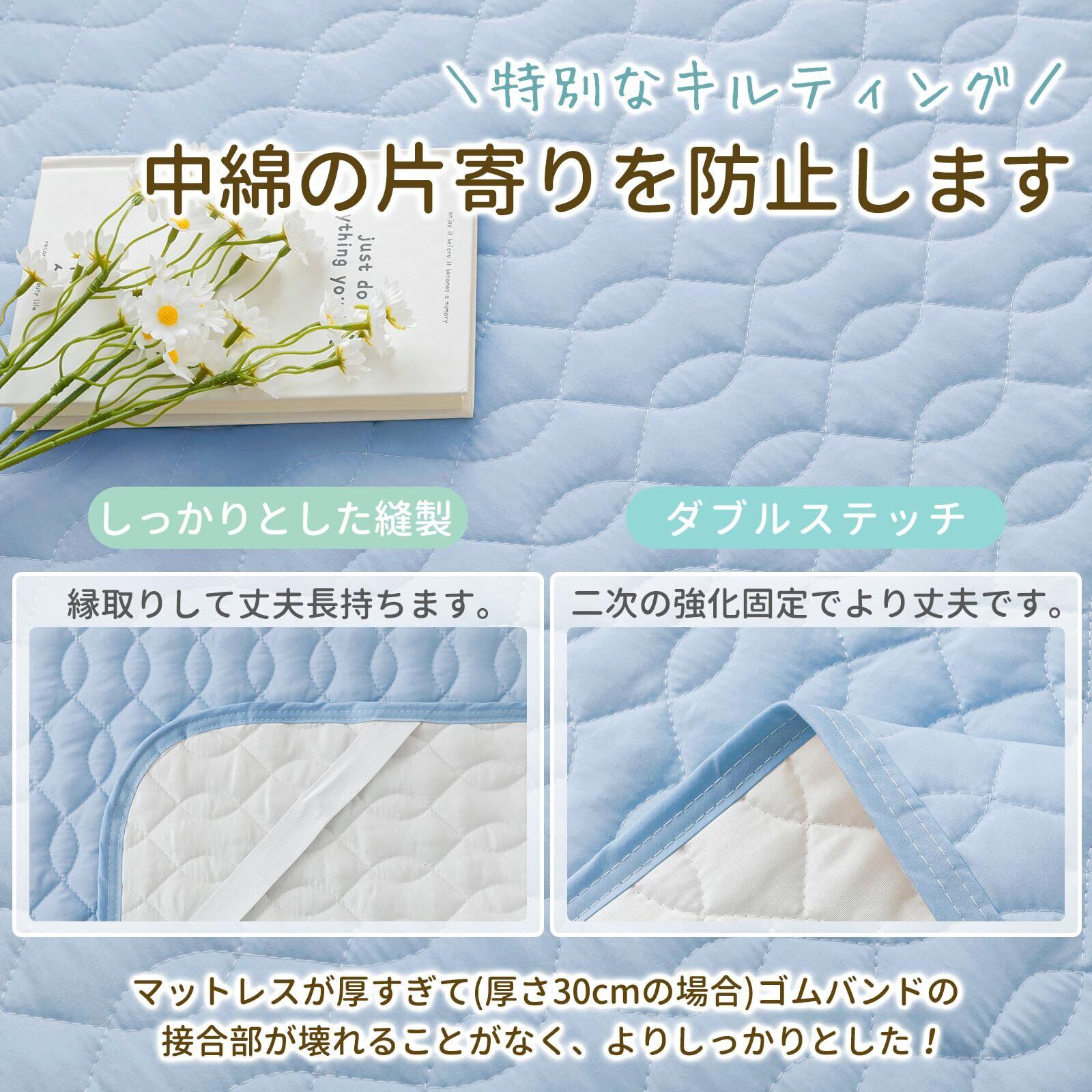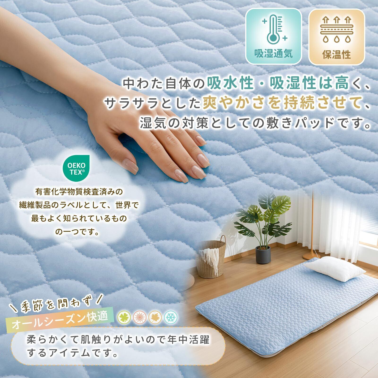 【お肌にやさしい心地】肌に優しい表地は通気性がよく、汗をかいても水分が素早く吸収し、すぐに乾きます。汗をかきやすい夏も快適な使い心地。吸水性と通気性に優れた素材のため、敷きパッドは汗などの水分をたっぷり吸収し、速乾してさらっと快適にお使いいただけます。蒸し暑い夏や、季節の変わり目に活躍します。