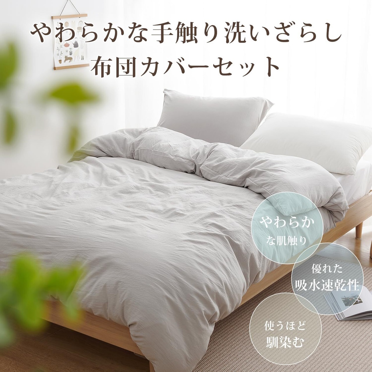 【在庫処分】クモリ(Kumori) 寝具カバーセット 布団カバーセット 洗いざらし シワ加工 水洗い やわらか (掛け布団カバー ボックスシーツ 枕カバー)吸水速乾 丸洗いOK 肌に優しい 洗える 無地 シンプル オールシーズン(シングル・3点セット ライトグレー)