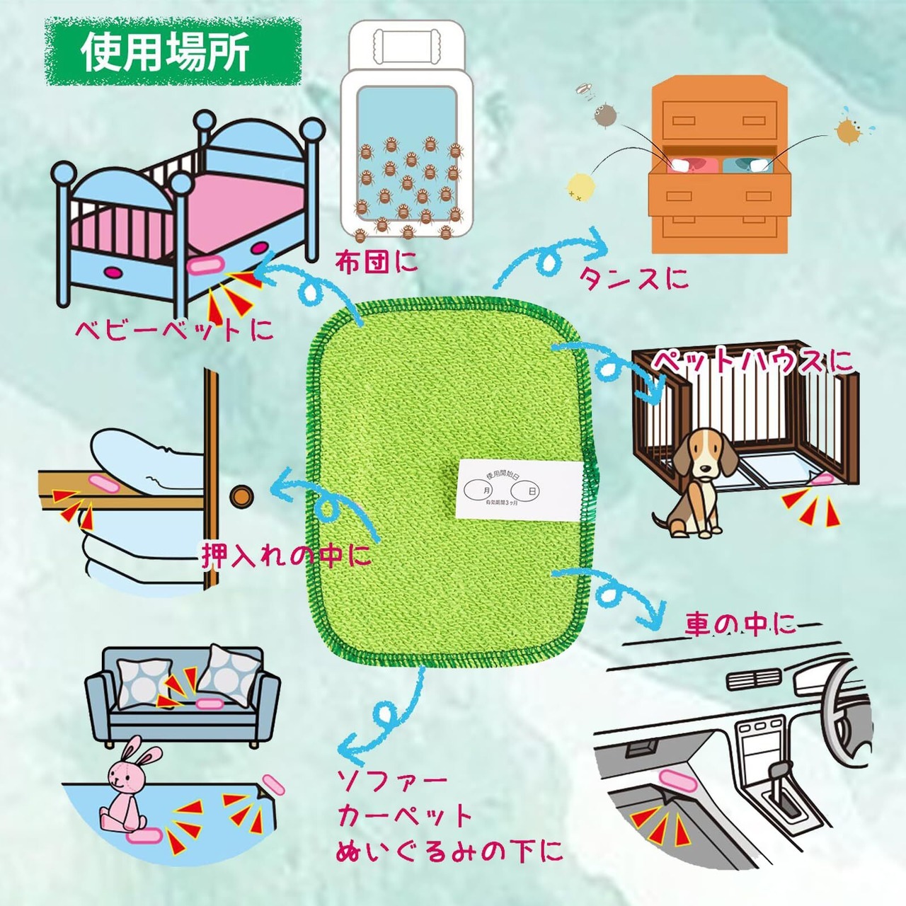 【使用場所】ベッド、マットレス、カーペット、ソファ、クローゼット、クローゼット、家具の下、車内など室内でダニが繁殖しやすい場所に置くだけで、簡単にダニ対策ができます。※ 全てのダニを捕獲するわけではありません。※ 粘着シート面における屋内塵性ダニ類の捕獲効果を確認しています。