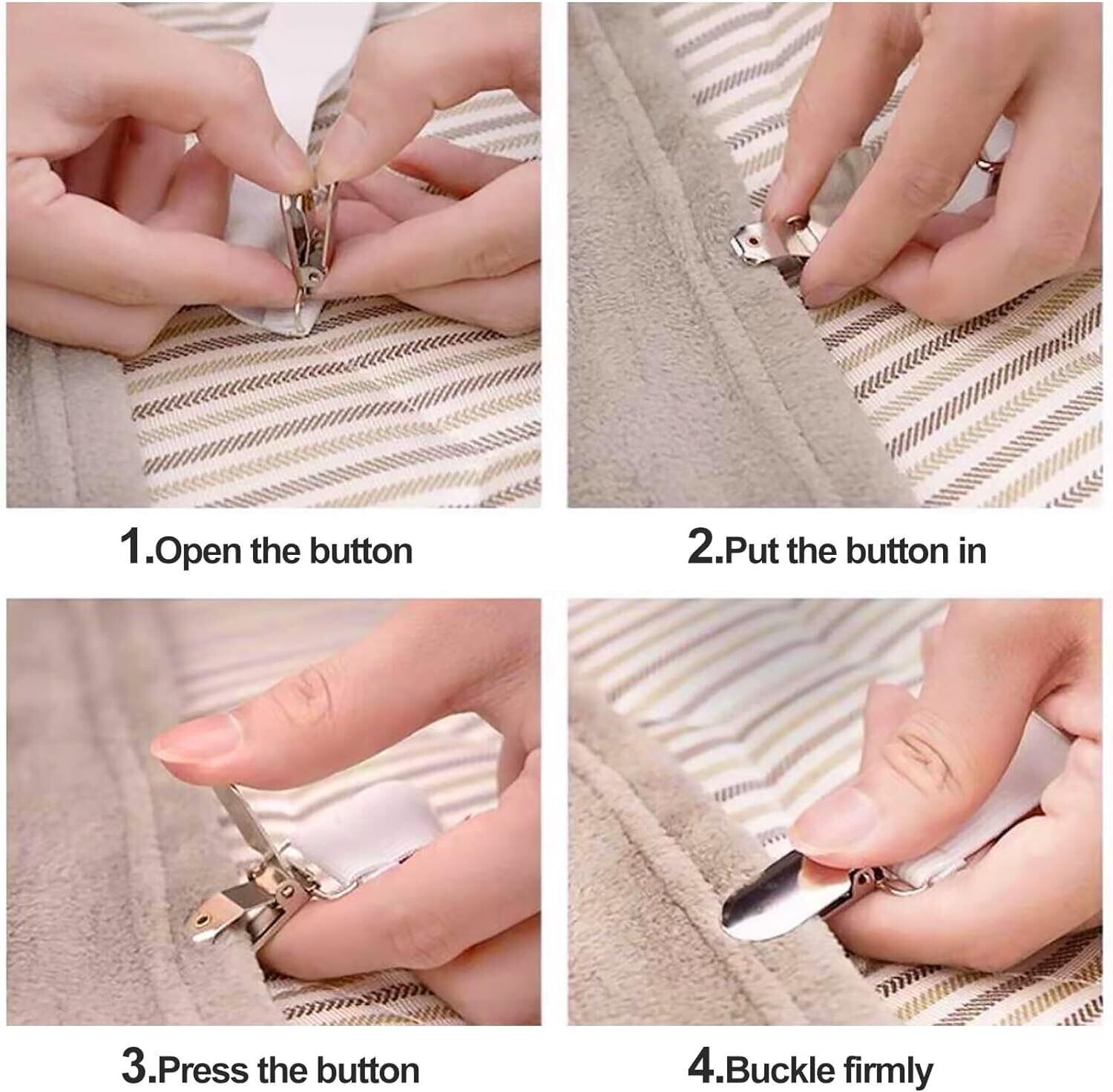 【操作簡単】この布団クリップを使用して、シートをクランプし、両側のストラップを正しい長さに短くして、シーツの四隅を固定し、簡単にシーツの乱れやズレを防止することができます。操作手順は下記ご参照ください。①ボタンを開きます。②ボタンをベッドシーツの四隅を裏側から入れます。③ボタンを押します。④バックルをしっかりと締めます。
