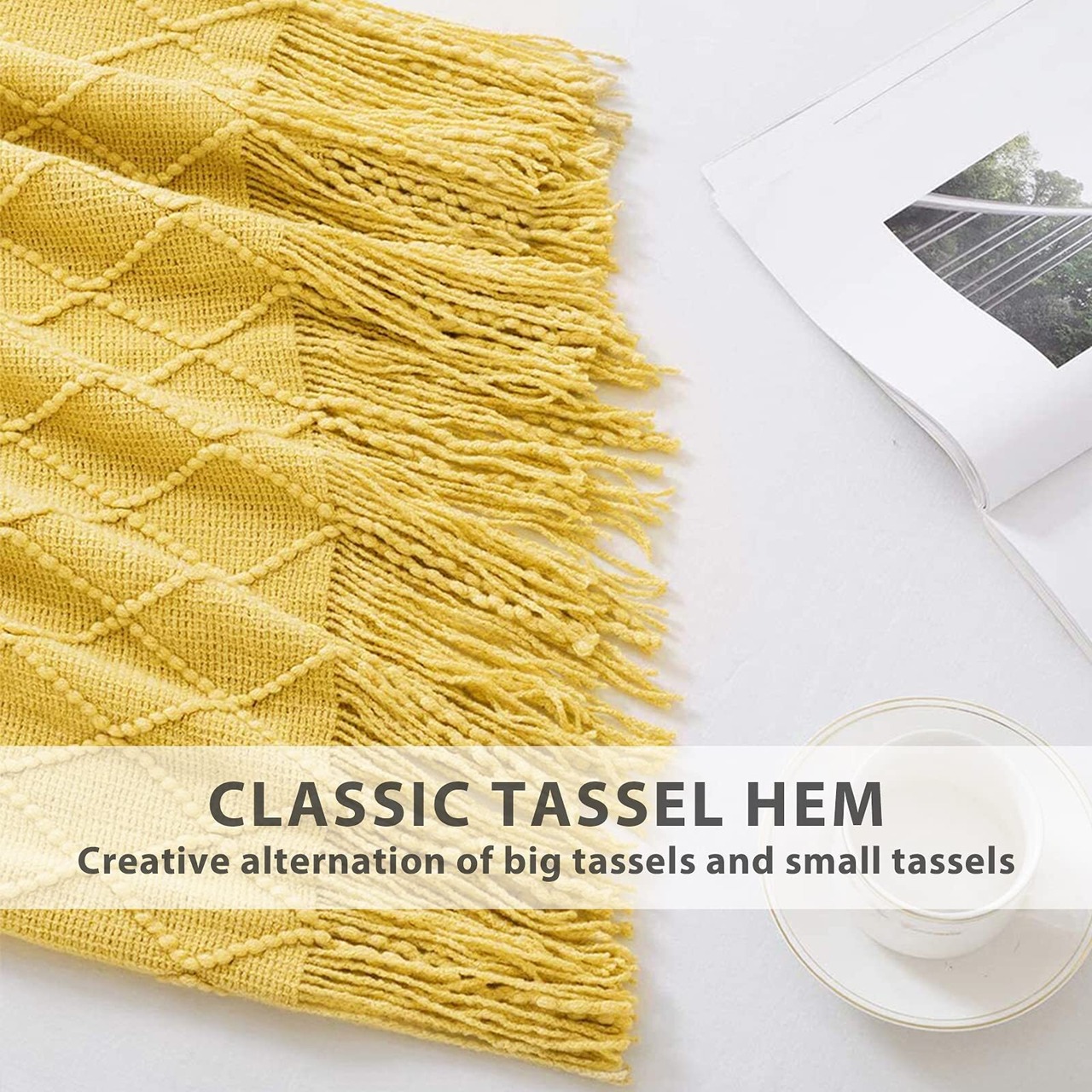 LumiSyne ニット ブランケット フリンジ付き 北欧風 ソリッドカラー マルチカバー おしゃれ ソファカバー カウチ ベッドカバー テーブルクロス毛布 大きい イエロー 130x170cm