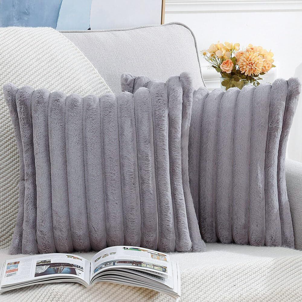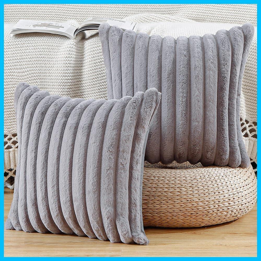 【在庫処分】MADIZZ 2枚セット フェイクファー プラッシュ スローピローカバー ふわふわストライプ ソフト装飾クッションカバー ソファ ベッドルーム ピローシェル用 55 x 55 cm グレー