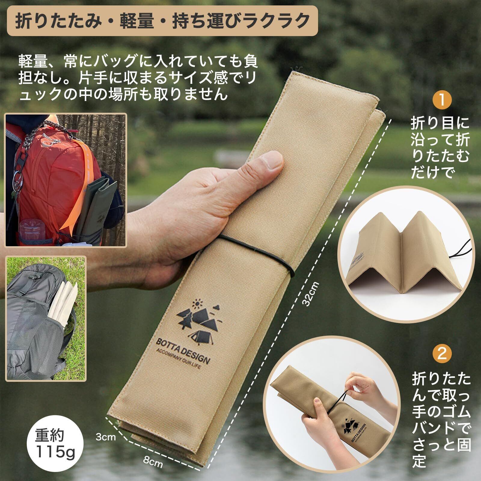 【仕様&材料】広げた状態:約32×32×1cm。折り畳んだ状態:約32×8×3cm。重量:約115g。折り畳みクッションの表面は高品質の防水ポリエステル製です、中間充填物は発砲ポリエチレン緩衝材。防水性、防湿性、断熱性、通気性、耐久性、クッション性に優れていますので。色褪せしにくい、水洗いもできるので汚れてしまっても安心!