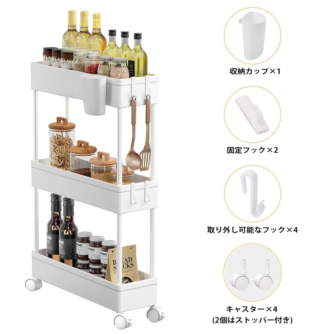 【人気商品】SIUSA キッチンワゴン キャスター付き ワゴン 隙間収納 スリム 収納カート キッチン 洗面所 収納 13.5cm 18cm 22cm 冷蔵庫横 台所 浴室 トイレ 細い棚 3段 4段 おしゃれ 組立簡単 フック&収納カップ付き (3段式-[13.5cm]-ホワイト)