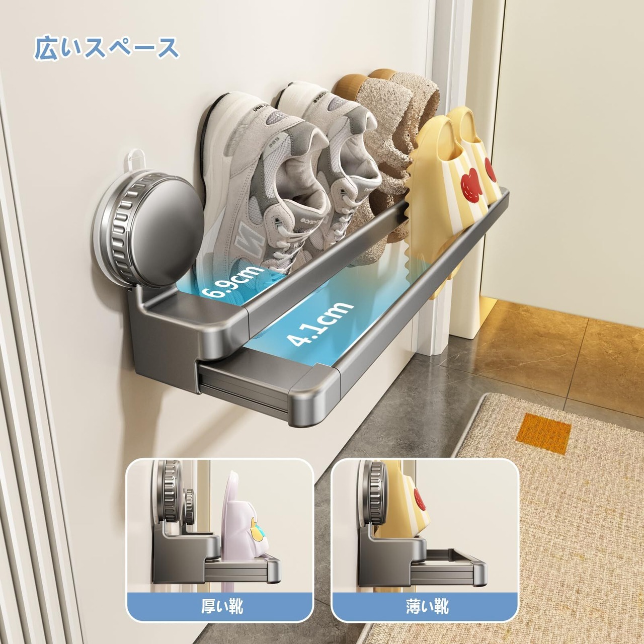 【取り付けが簡単】のスリッパラックは工具やネジを使わずに壁に穴を開ける必要なく、強力粘着吸盤で壁に貼り付けて壁を傷つけません。強力な粘着吸盤なので、落ちる心配がありません。(ご注意:タイル、ガラス、木製の壁、金属など、ほとんどのツルツルな壁に対応できますが、粗すぎる表面には適用していません。)