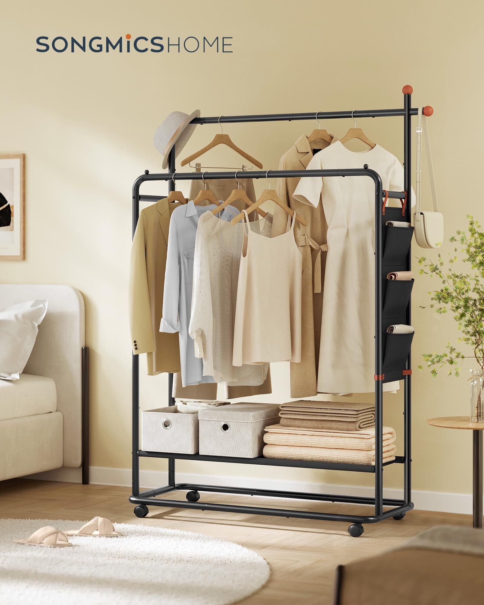 SONGMICS HOME ハンガーラック 2段 頑丈 衣装ラック 洋服・コード掛けパイプハンガー 棚 キャスター付き 幅103cm 衣類収納 安定性 移動しやすい ちょうどいいサイズ 室内物干し ブラック HSR171B01