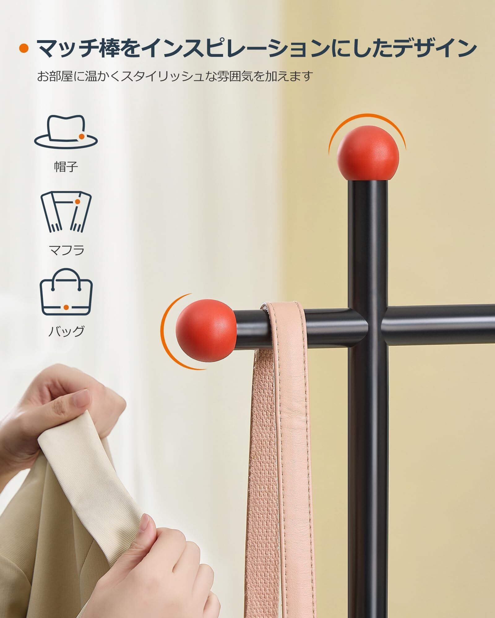 【独特な外観デザイン】マッチ棒をインスピレーションにしたデザインが目を引くこの2段式ハンガーラックは、ファッションと実用性を兼ね備えており、お部屋に温かい雰囲気を演出します。また、帽子やバッグをかけるポールハンガーとしても使用できます。洋服掛けだけでなく、小物の整理にも最適です!日常の使いやすさを追求しました。