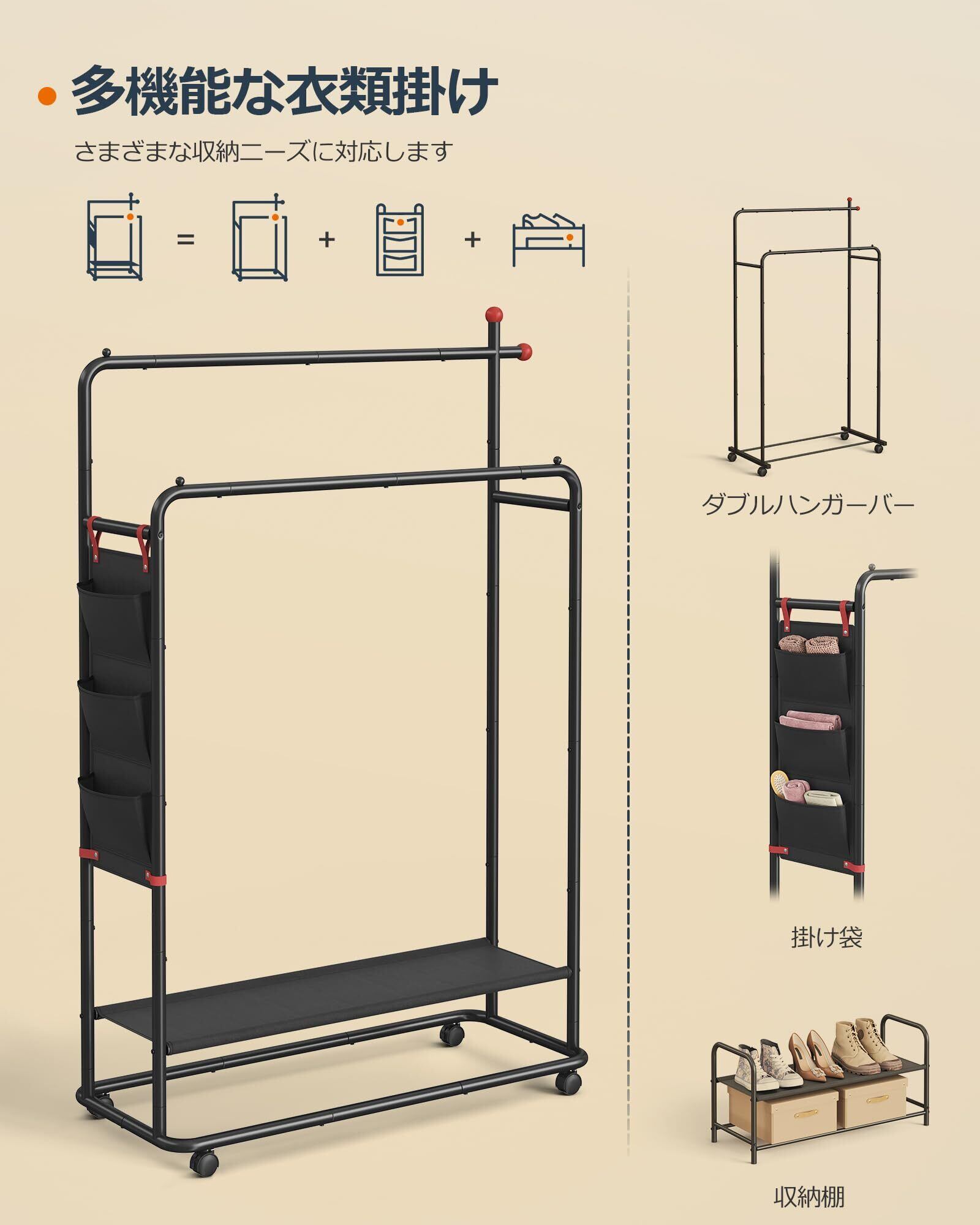 【数量限定】SONGMICS HOME ハンガーラック 2段 頑丈 衣装ラック 洋服・コード掛けパイプハンガー 棚 キャスター付き 幅103cm 衣類収納 安定性 移動しやすい ちょうどいいサイズ 室内物干し ブラック HSR171B01