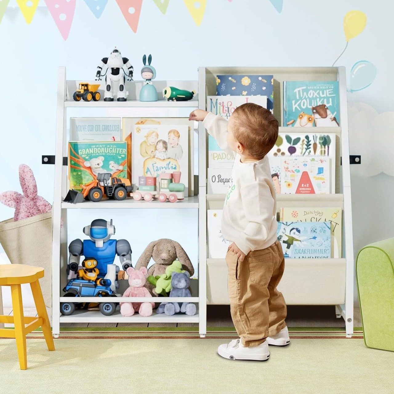 【お子様の“はじめての本棚”にぴったり】高さ75cmのキッズ用絵本ラックは、お子様の目線に合わせた設計で、絵本の取り出しやすさ抜群。不織布×鉄パイプの3段ポケットで、お気に入りの絵本を楽しく収納できます。