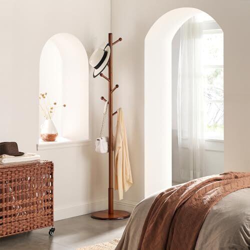 VASAGLE コートハンガー ポールハンガー フリースタンディング 7つの丸いフック付き 木製ホールツリー 玄関コートスタンド 服 帽子 財布 玄関 リビングルーム ダークウォールナット ブラウン RCR07WN
